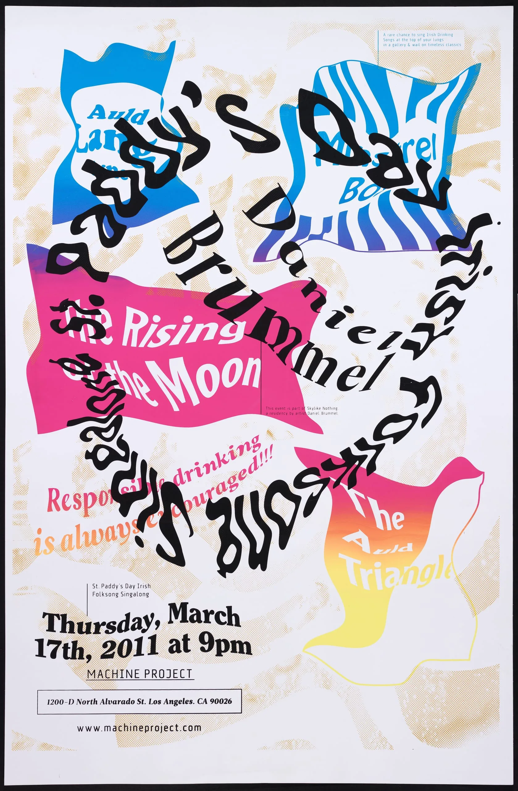 Machine Project began commissioning hand-printed posters early in its history. Collaborators included both established designers such as Ed Fella and Willem Henri Lucas, as well as emerging practitioners and students from the California Institute of Arts, where Allen completed his graduate work. He provided few guidelines and scant event details to the designers, instead allowing them space for creative experimentation. As a result, the posters formed what he called "an alternative history" of the organization, as well as a visual archive of graphic design in an era when the increasing dominance of web-based communications led to rapid changes in aesthetics and processes. While the posters were sometimes displayed in the organization’s storefront window to promote upcoming events, the majority were completed shortly before the happenings they advertised and instead served mainly as commemorative artifacts for participants and attendees.