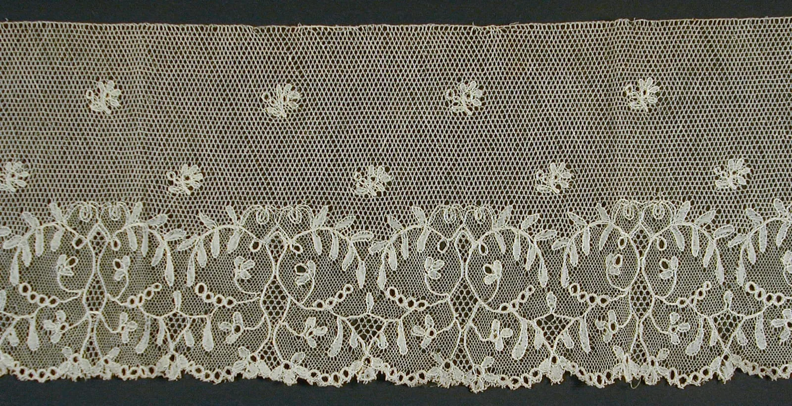 Horizontal strip of cream-colored needle or bobbin lace with a hexagonal net ground, scattered floral motifs, and a dense scrolling vine border along the scalloped lower edge