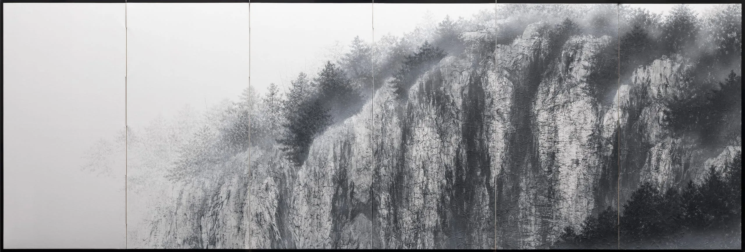 - Six-panel folding screen; acrylic and natural pigments on Japanese mulberry paper mounted onto boards