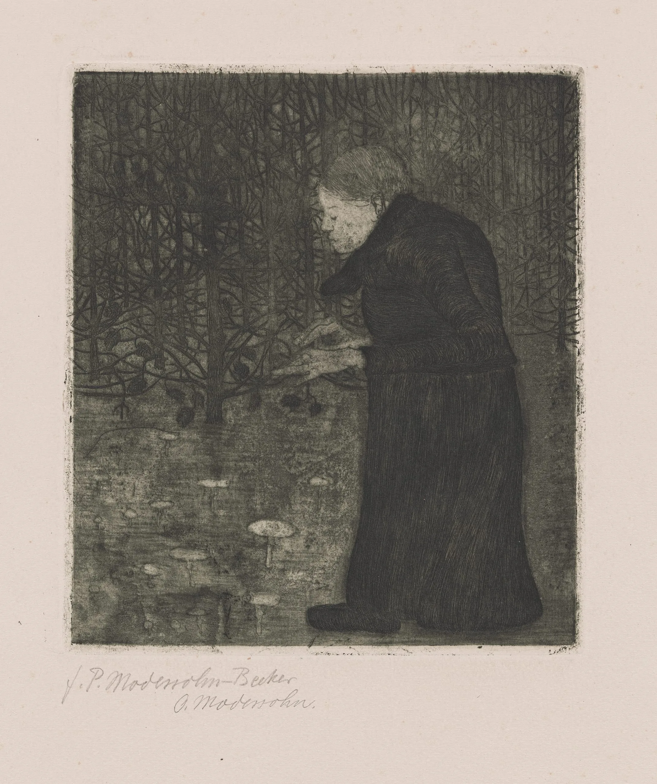 Paula Modersohn-Becker is recognized as an important early twentieth-century artist in spite of her tragically short life. Her subjects were considered typical for a woman artist—femininity, sexuality, and motherhood— but her compositions and style were decidedly modern. Modersohn-Becker studied in Paris, where she encountered the works of Paul Cézanne, Maurice Denis, and Paul Gauguin. Although she created few prints, this work, made when she was twenty-four, shows her potential in the medium. Her experiments with a variety of intaglio processes create contrasts between line and tone that are especially pronounced in the landscape, where the speckled ground of the mushroom-bedecked forest is overlaid with a wall of leafless trees depicted as webs of line.