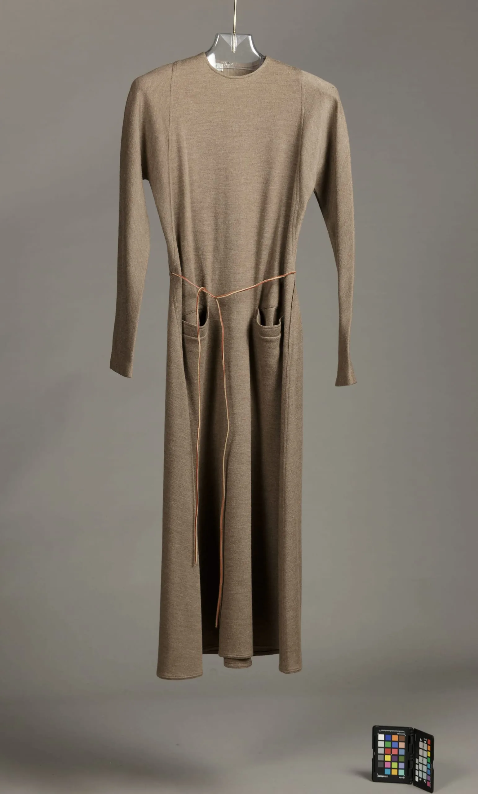Full-length knit dress in khaki-tan, displayed on a hanger, with long fitted sleeves, patch pockets at the waist, and a thin terra-cotta cord tied loosely at the waist