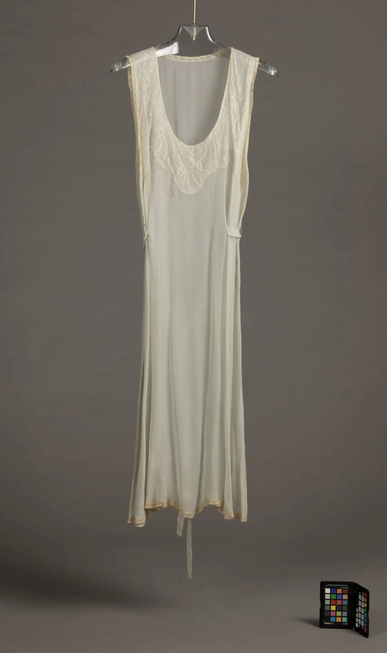 Ivory silk slip dress with lace bodice panels displayed on a clear hanger against a gray background, floor-length with narrow shoulder straps