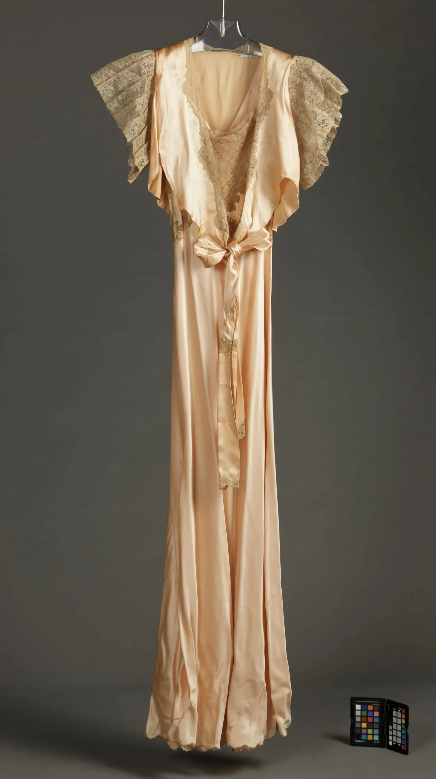 - Bed Jacket and Nightgown: Silk crepe back satin with silk net lace