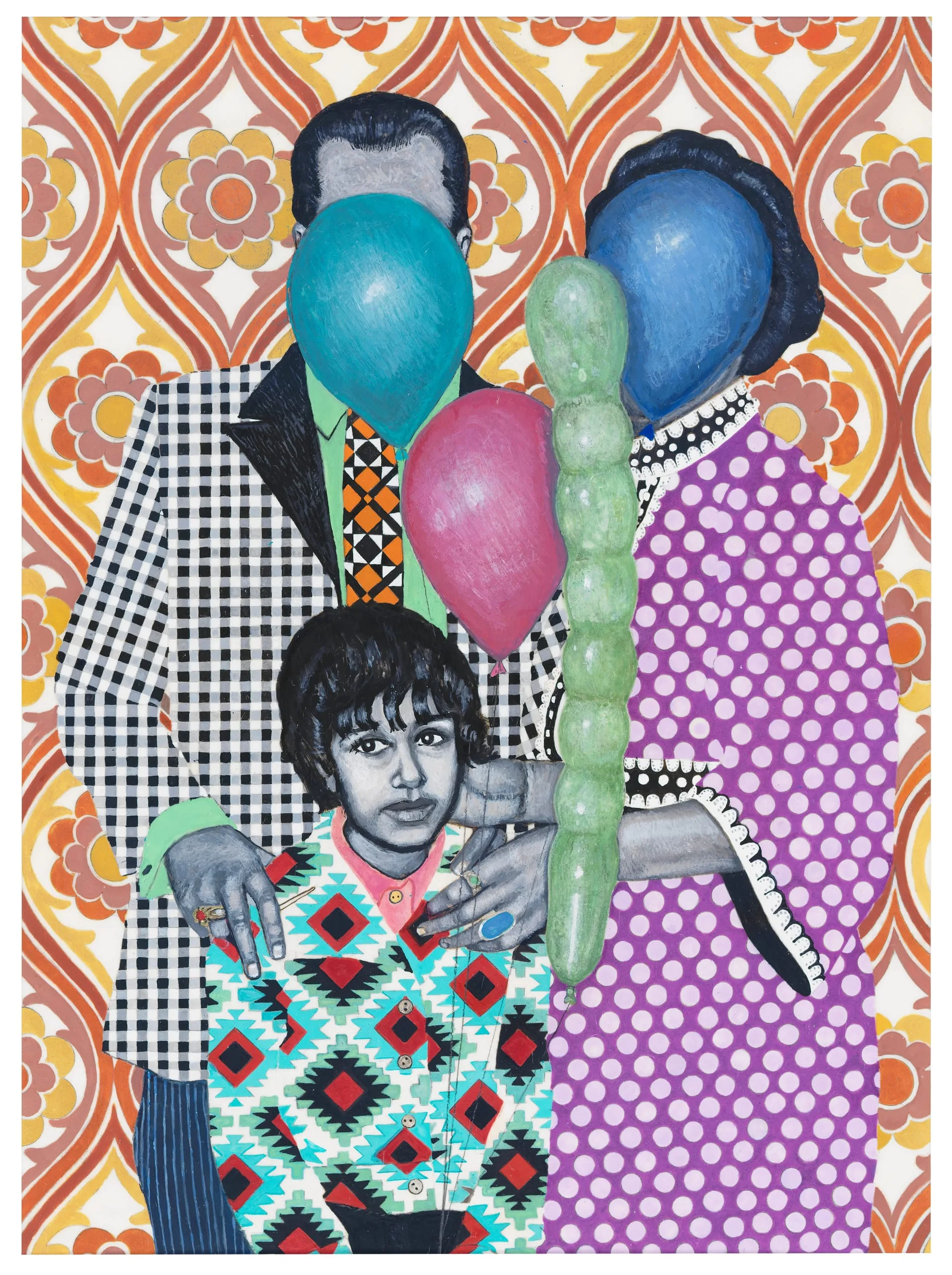 In Soheila Sokhanvari’s Party People, a mother and father pose with their young daughter, though the faces of both parents are obscured by colorful balloons. The flesh and hair of the figures is rendered in black-and-white, suggestive of the old family photograph that inspired the painting, which along with the sad-faced child, contrasts starkly with the festive patterns of their clothing and the backdrop behind them. The juxtaposition between bright colors and grayscale, and between the dimensionality of Sokhanvari’s photo-realism and the flatness of her invented patterns, places the work somewhere between the absurd and the tragic, between celebration and sorrow.