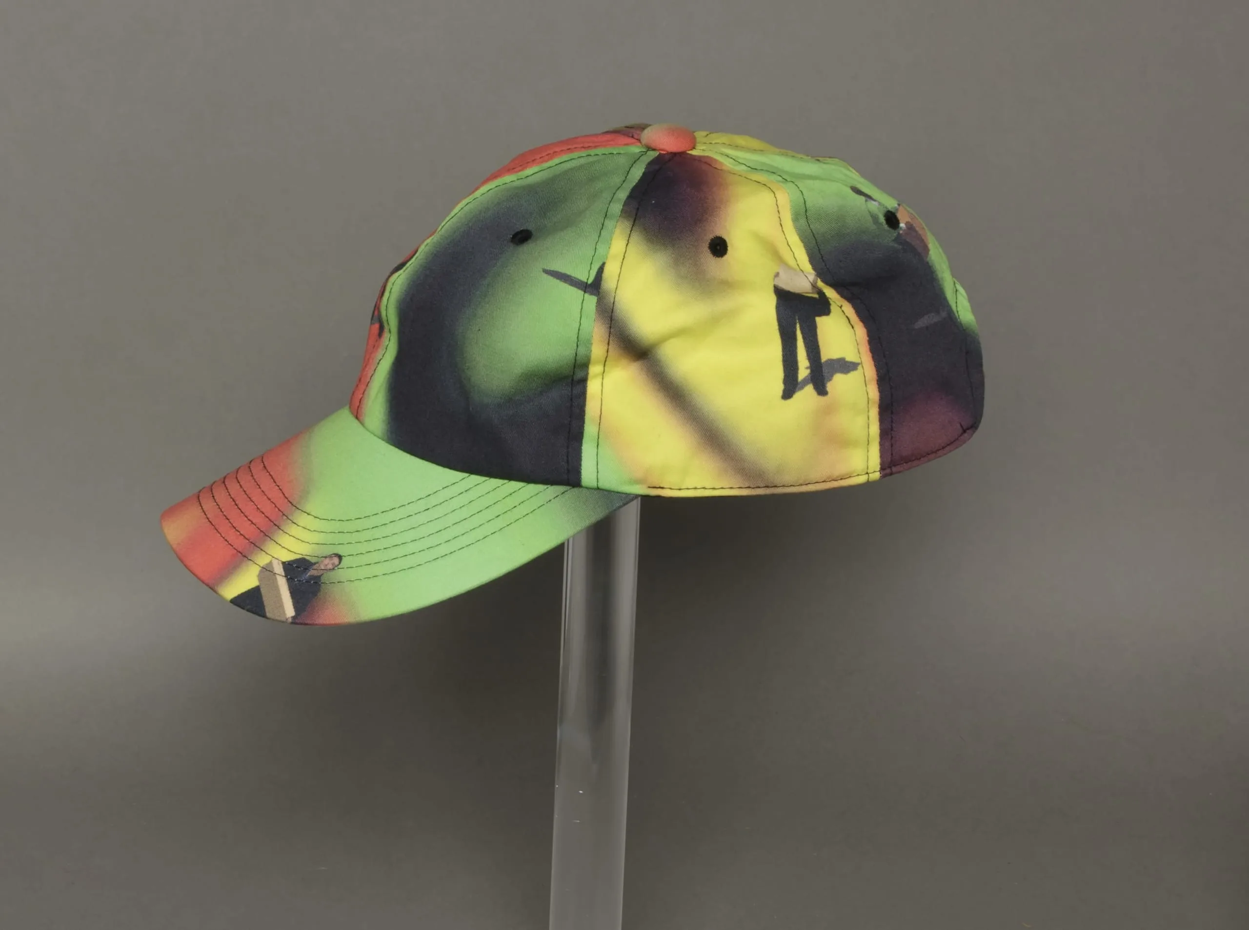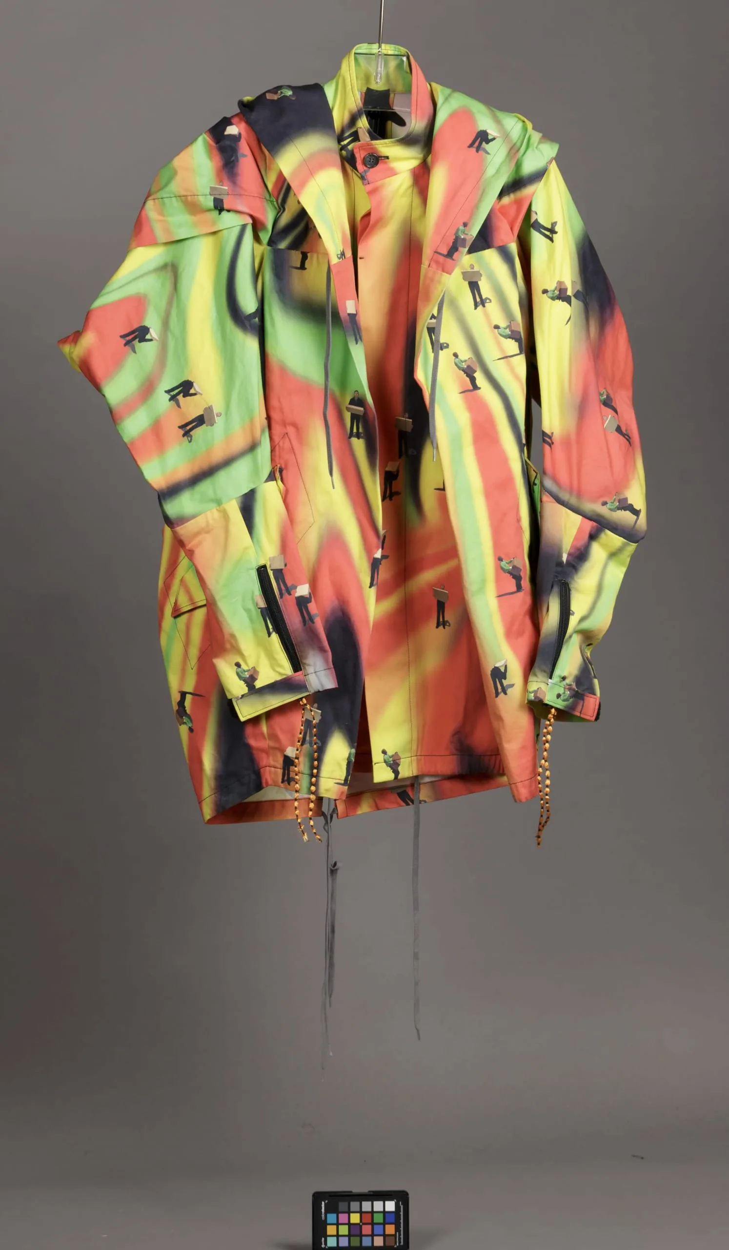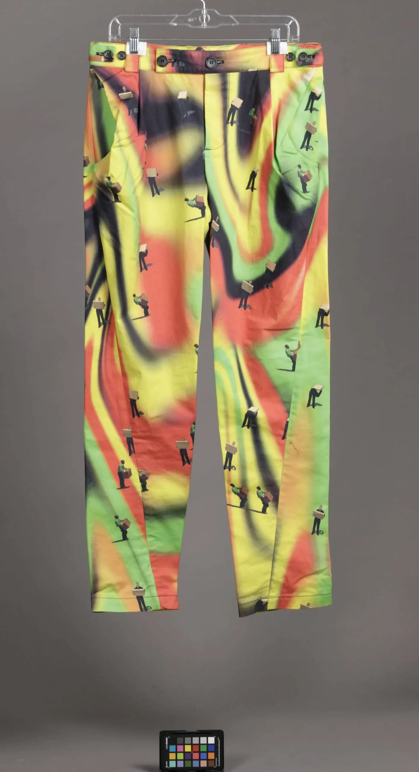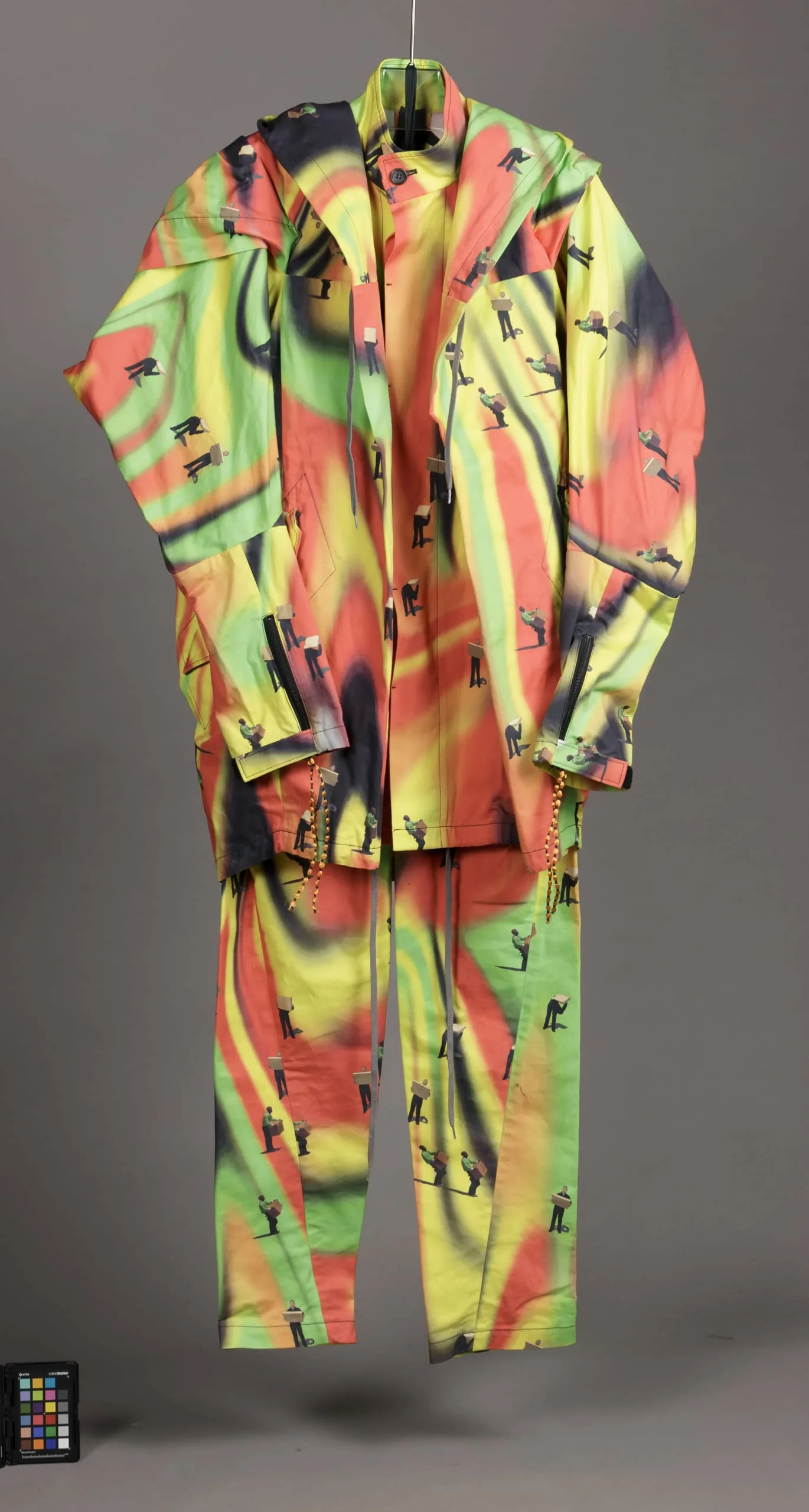 - Jacket: Cotton plain weave, printed; Pants: Cotton plain weave, printed; Hat: Cotton plain weave, printed; Shoes: Leather, printed, and rubber