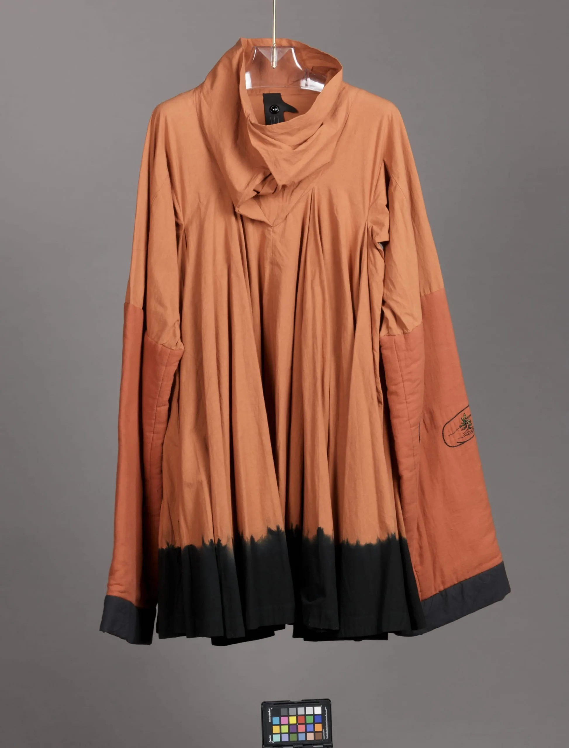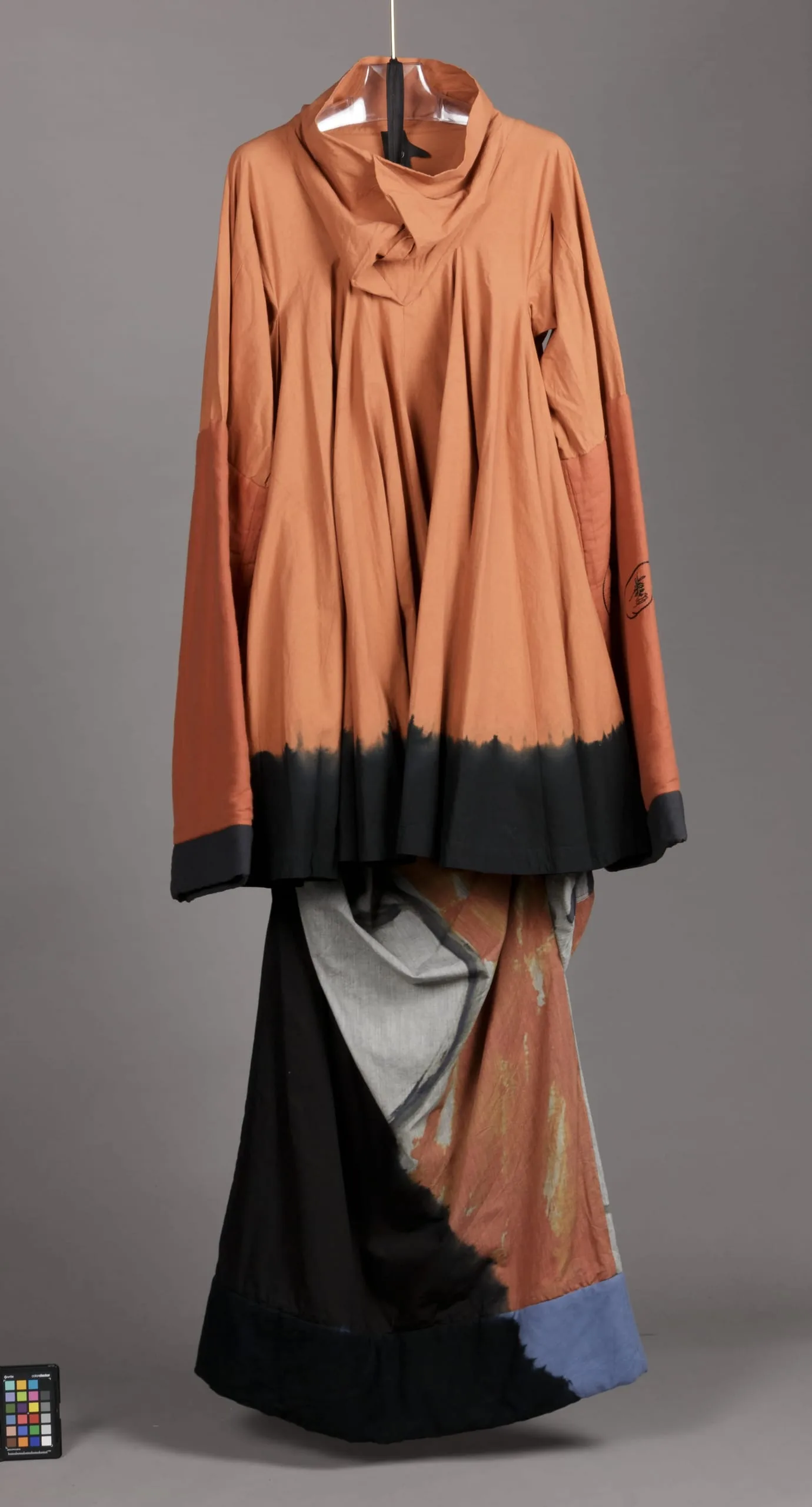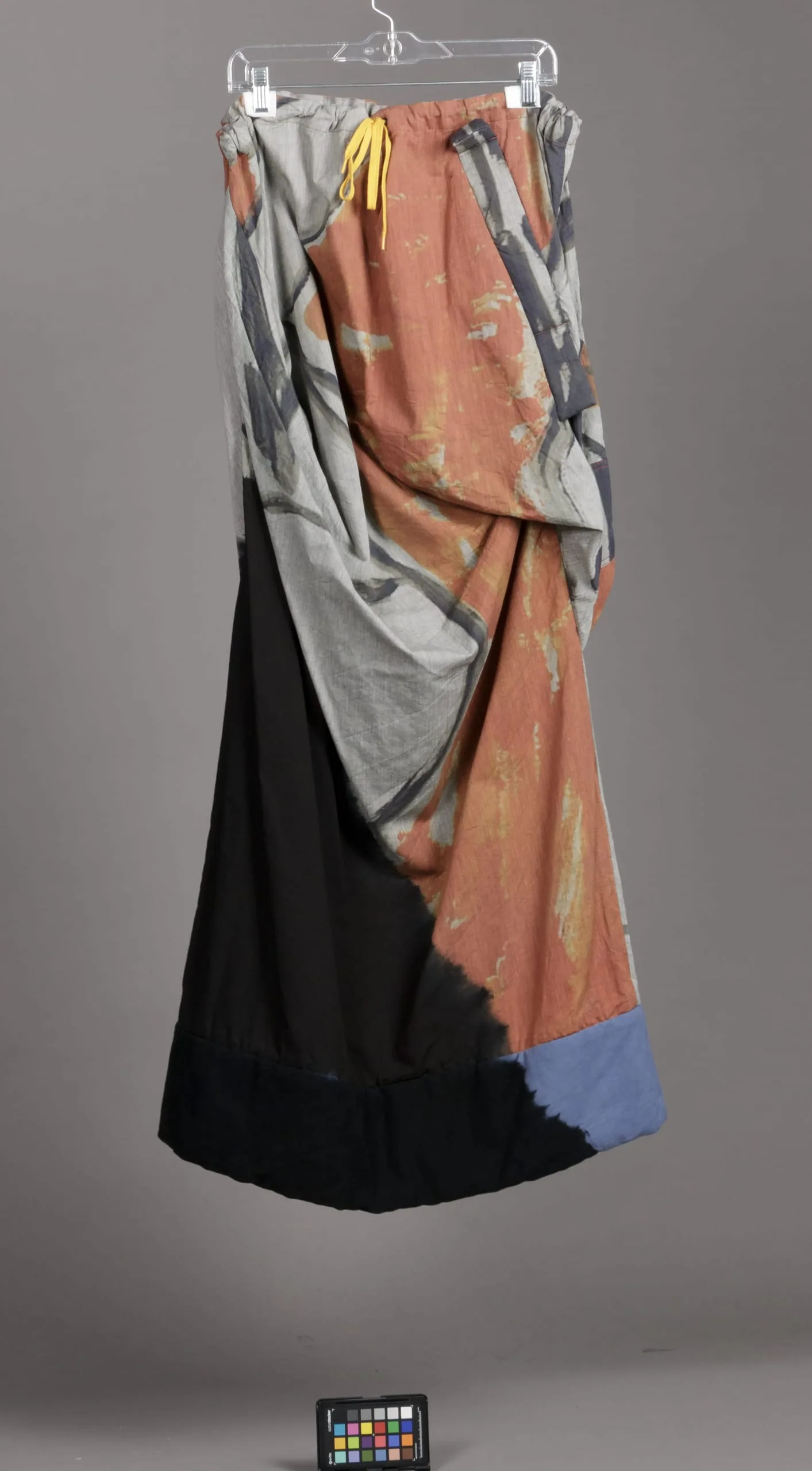 - Tunic: cotton plain weave, resist dyed; Skirt: cotton plain weave, printed; Shoes: cotton velveteen, cork, and leather