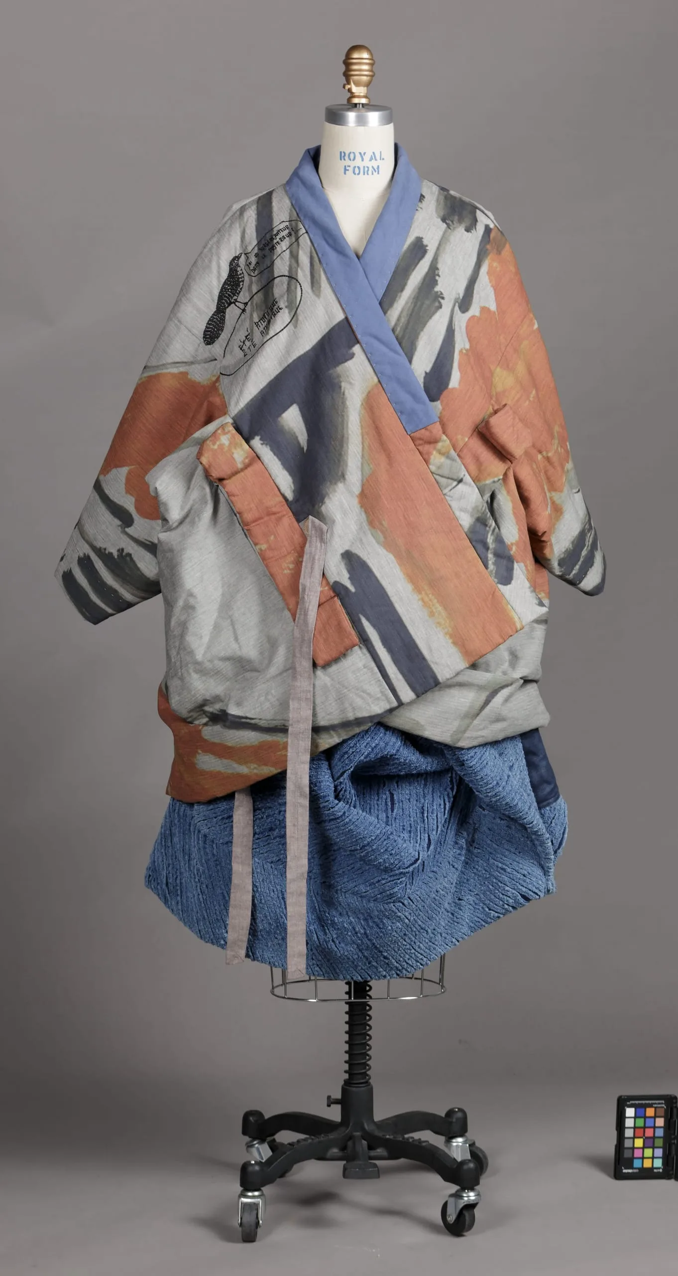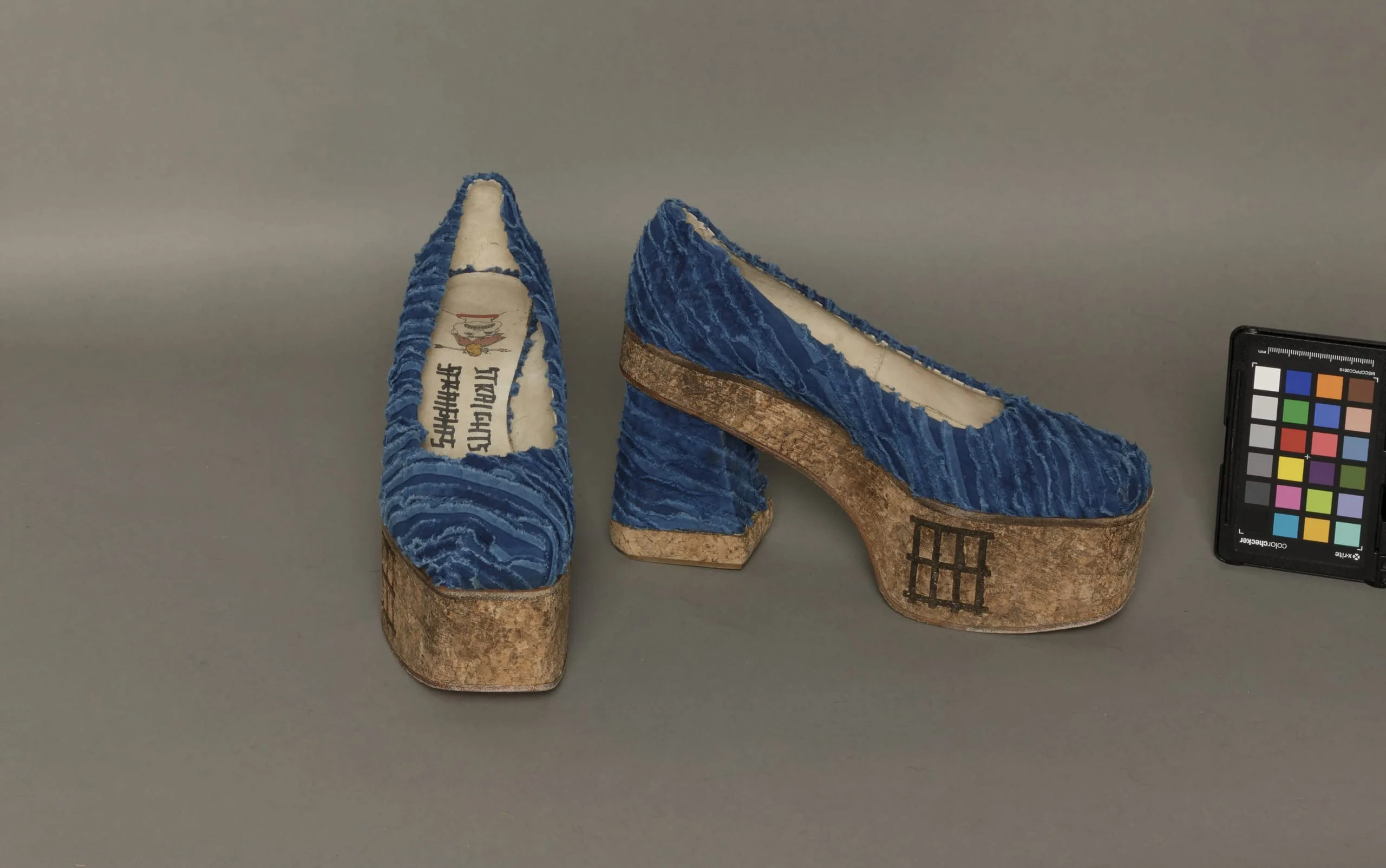 - Jacket: cotton/wool plain weave, printed; Skirt: cotton twill (denim), wash finish; Shoes: cotton twill (denim), wash finish