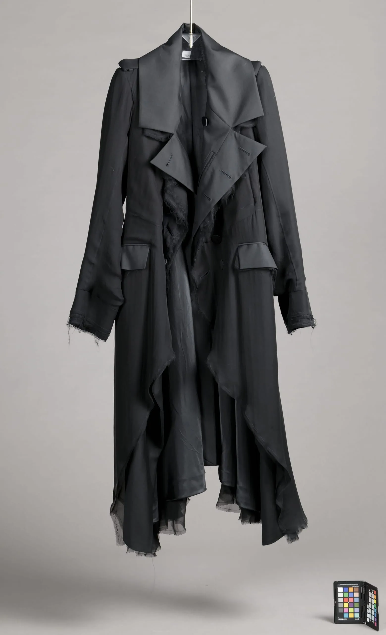 - Silk plain weave (chiffon) and silk/wool twill (gabardine) with silk satin (peau de soie) covered buttons