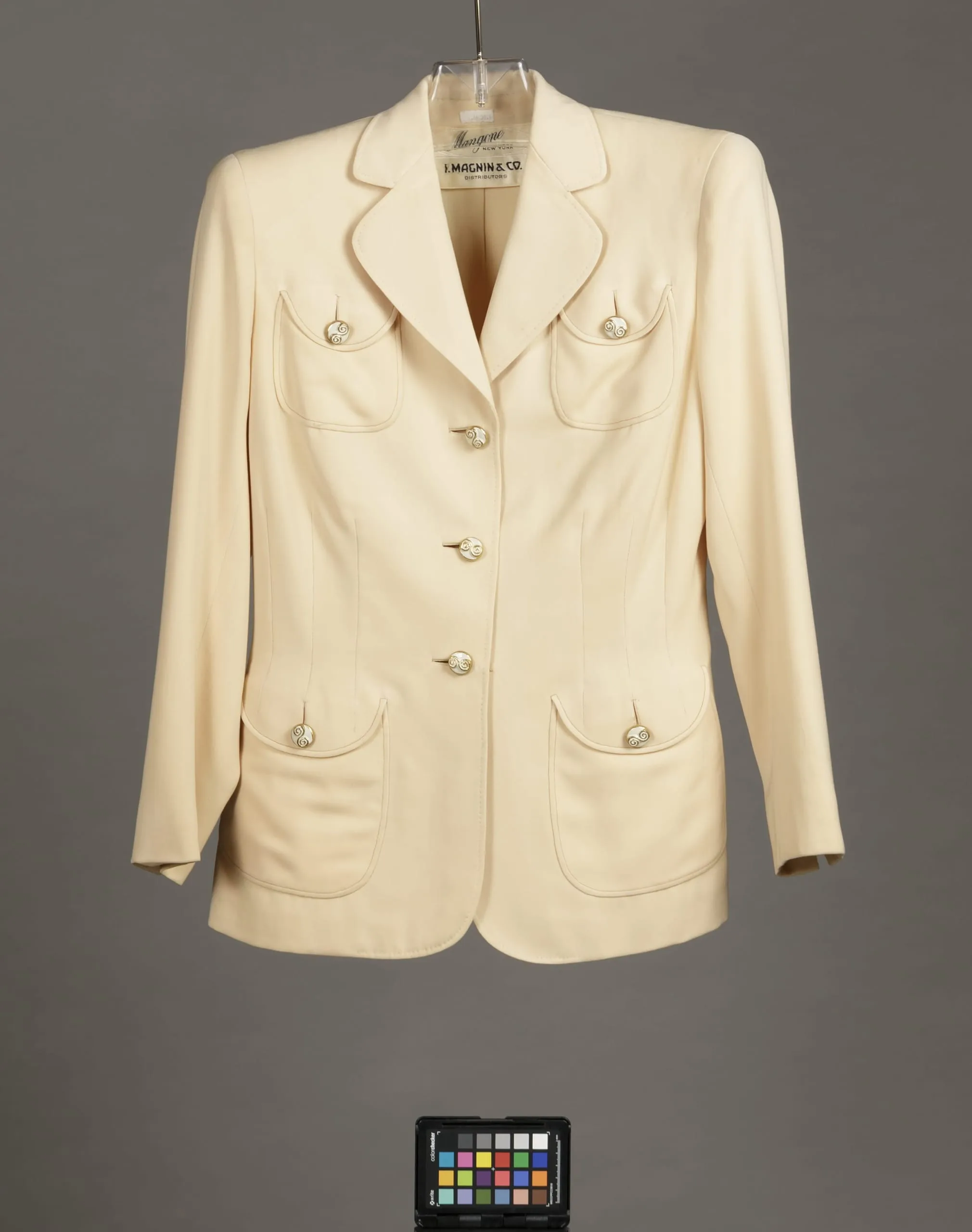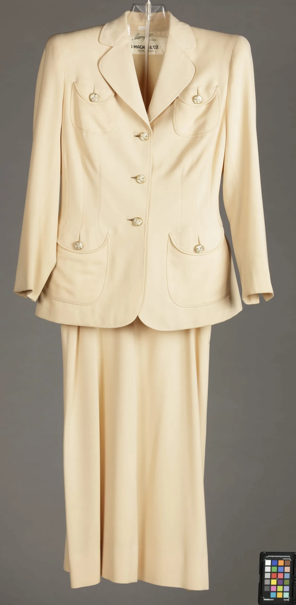 - Jacket: wool twill with metal enamelled buttons; Skirt: wool twill