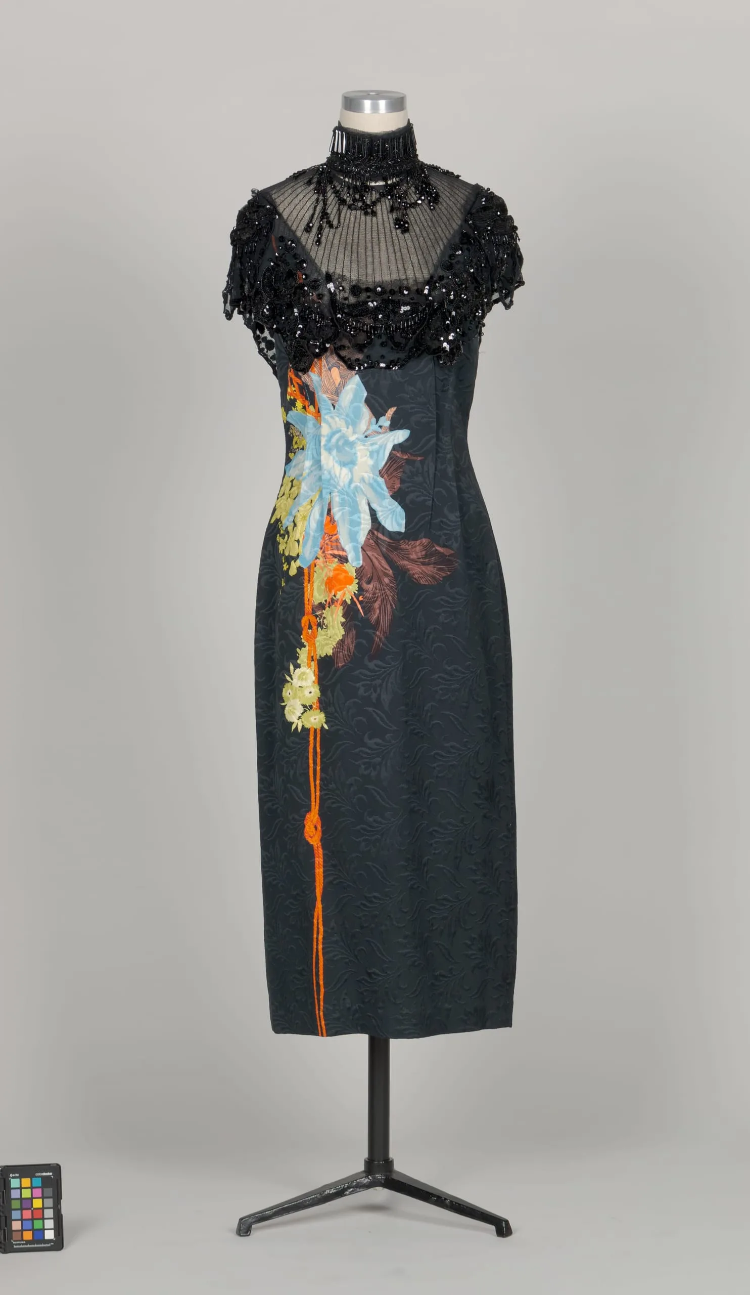 - Dress: Viscose (rayon)/cotton matelassé, printed, and cotton/silk net with glass beads