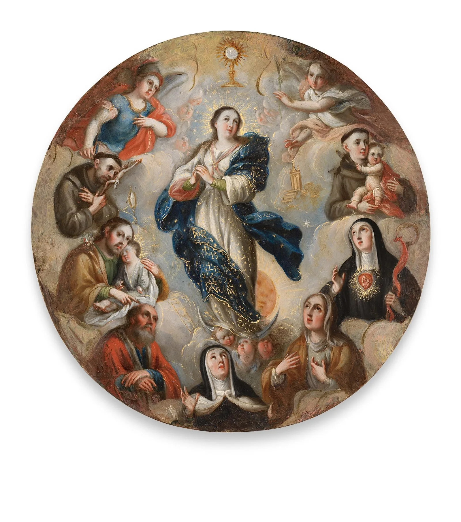 The work bears the unmistakable style of Antonio de Torres, who is credited with impelling an important stylistic shift in the early eighteenth century. He catered to several patrons in Mexico City, as well as some in other towns, and also shipped a considerable number of works to Spain. Here, a cascade of gently arranged figures encircles an image of the Immaculate Conception crowned by the Eucharist. On the left, in descending order, are Saint Michael, Saint Francis of Assisi, Saint Joseph cradling the sleeping Christ Child, and Saint Joachim; on the right are Saint Anthony, Saint Gertrude with a flaming heart, and Saint Anne. At the feet of the Virgin is the famed Spanish mystic Saint Teresa of Ávila (1515–1582), a model of religious perfection and a particularly suitable choice for this kind of object. The figures’ distinctive aquiline noses and pale complexions with rosy cheeks, as well as the upward gazes of those contemplating the Virgin, closely resemble the types in Torres’s series of the Life of the Virgin (1719; Colegio Apostólico de Propaganda Fide de Guadalupe, Zacatecas, Mexico), as does the work’s soft palette with pastel tonalities. Another distinguishing similarity is the angel on the right looking out and pointing toward the Virgin, as if inviting the viewer to reflect on her mystery.