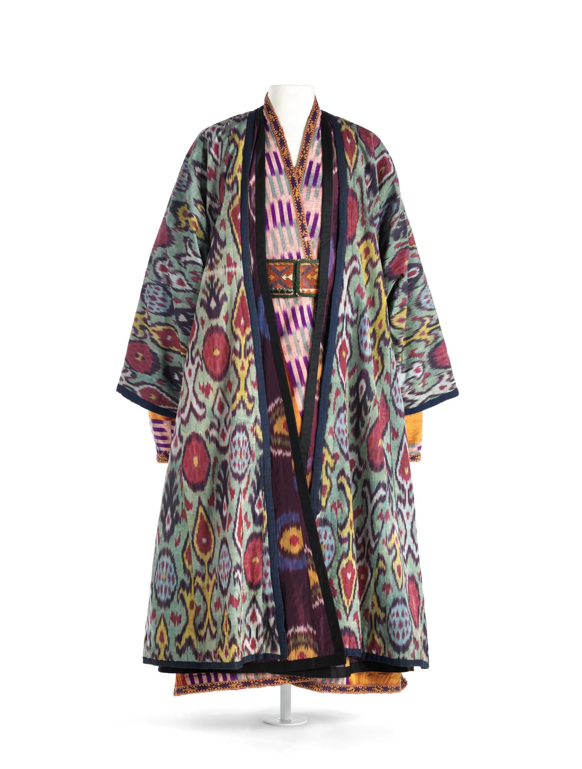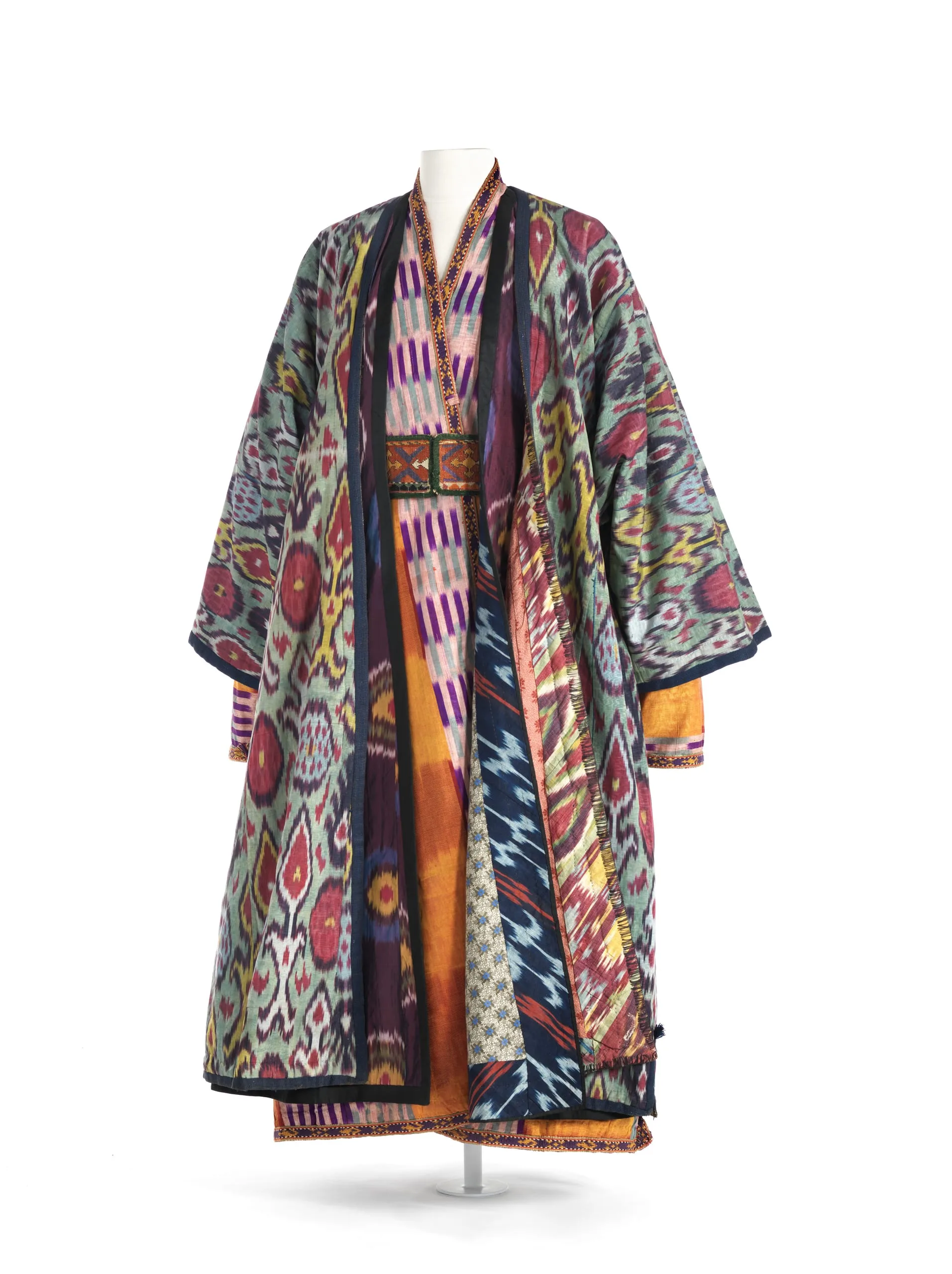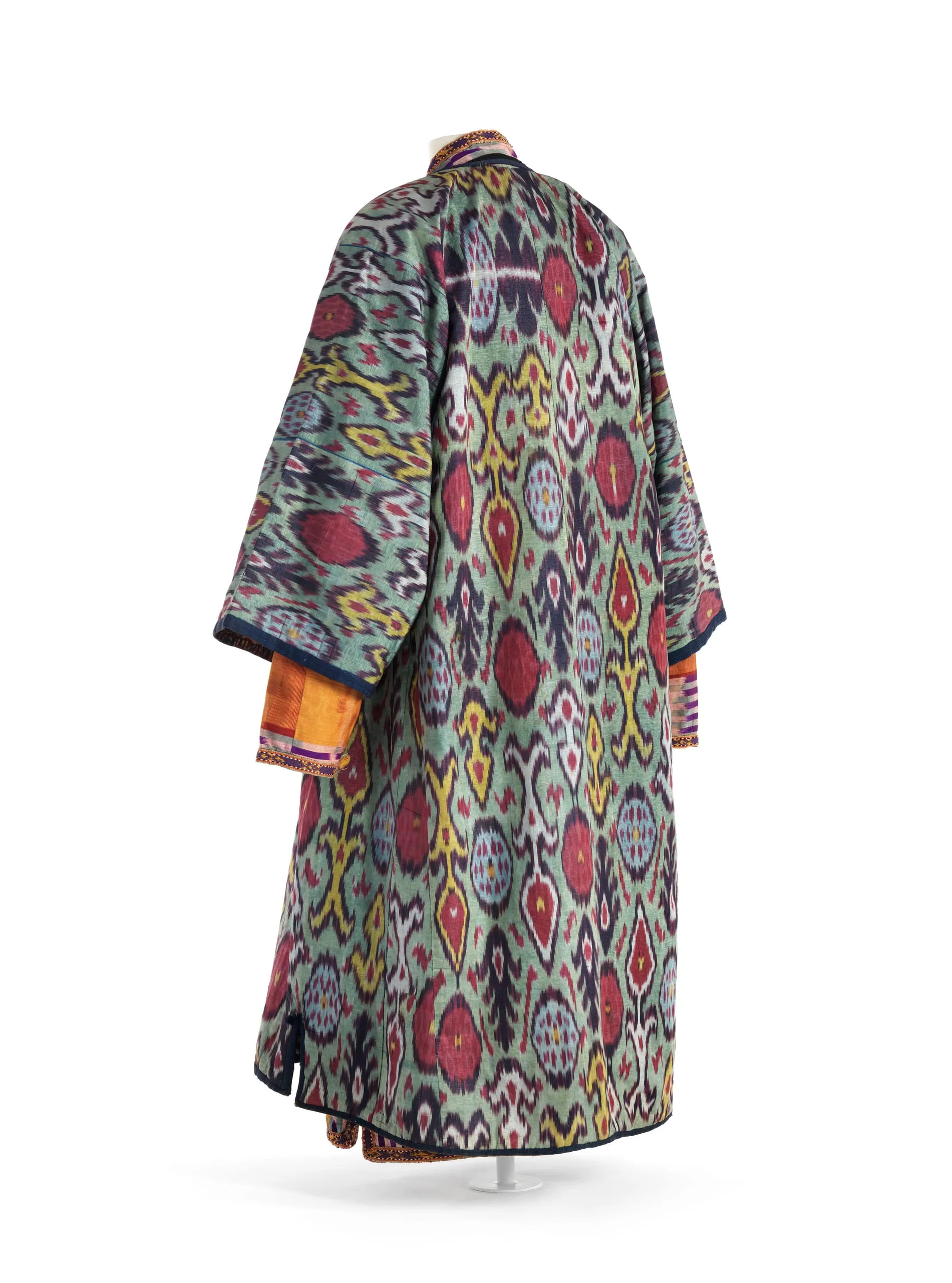 - Silk and cotton plain weave with tie-resist dyed warp (ikat) (adras), moiré finish, and silk warp-twined loop manipulation; Lining: cotton plain weave, printed, and silk and cotton plain weave with tie-resist dyed warp (ikat) (adras)
