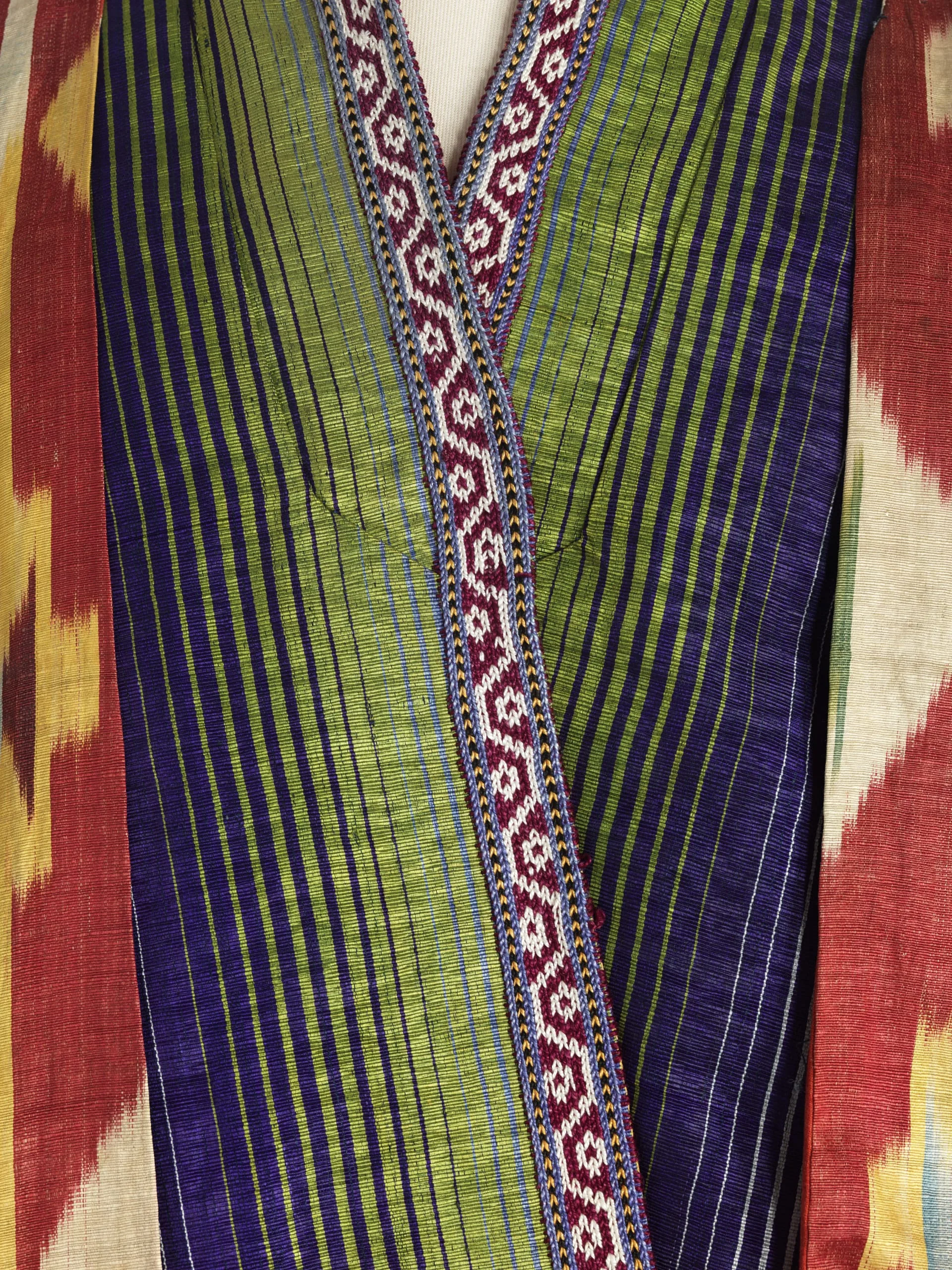 - Silk and cotton plain weave (alacha), moiré finish, and silk warp-twined loop manipulation; Lining: Cotton plain weave, printed, and silk and cotton plain weave (alacha)