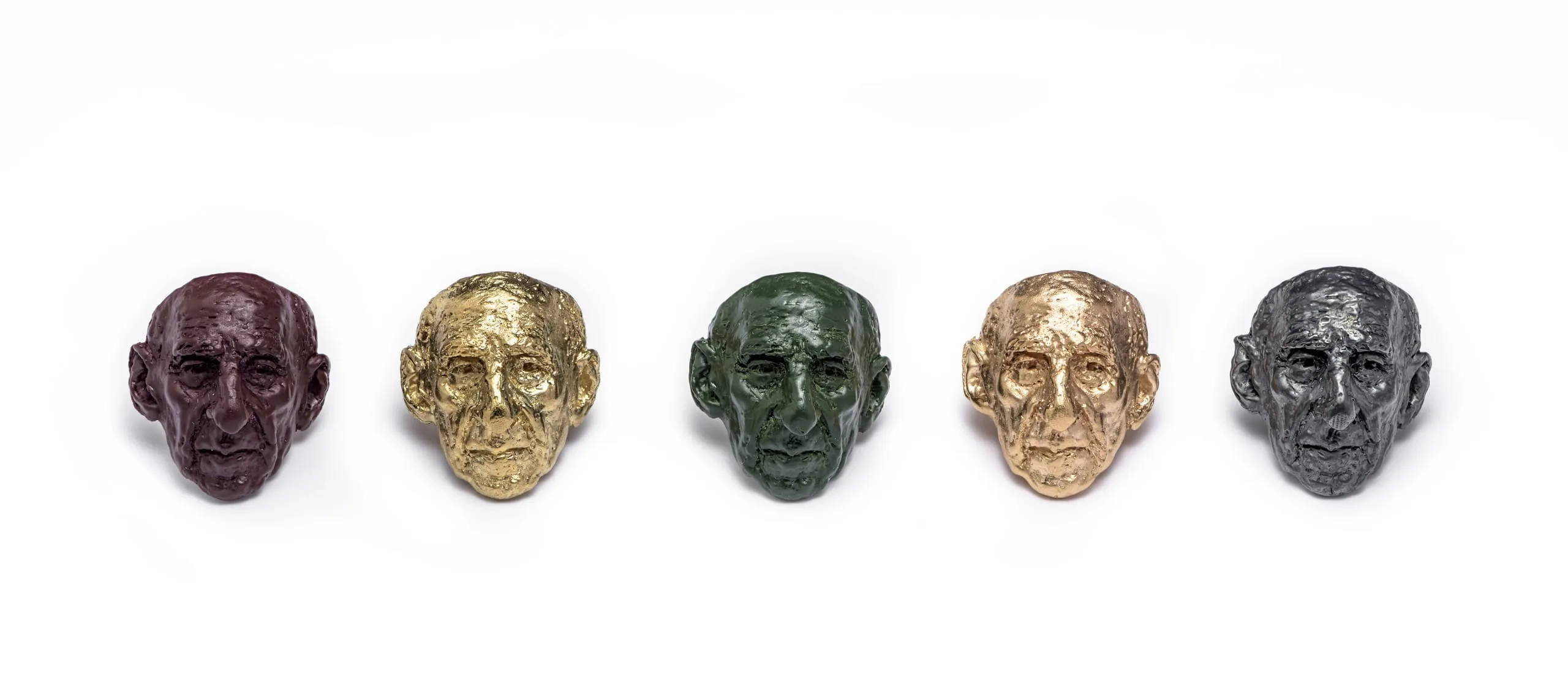 These rings by Koushna Navabi are small yet detailed busts of Mohammad Mossadeq, Iran’s prime minister from 1951 to 1953. In 1952 Mossadeq, a staunch nationalist, ended the British oil concession in Iran, which triggered a confrontation that would lead to his overthrow the following year by a British-and-American-led coup. In contrast with large-scale public monuments, Navabi’s rings function as a personal and portable form of adoration.