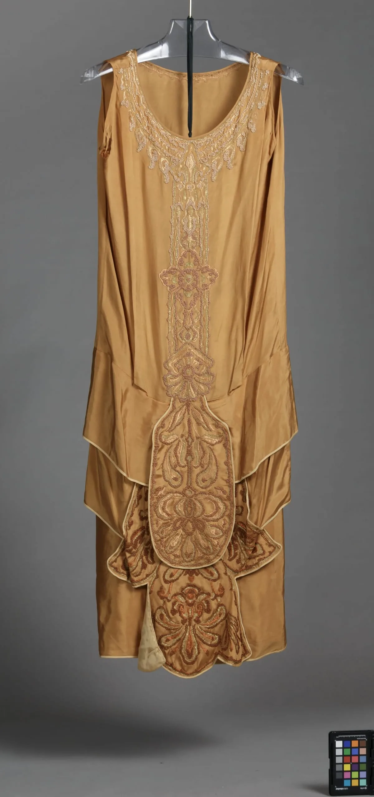 - Silk satin with silk and metallic-thread embroidery, with glass beads
