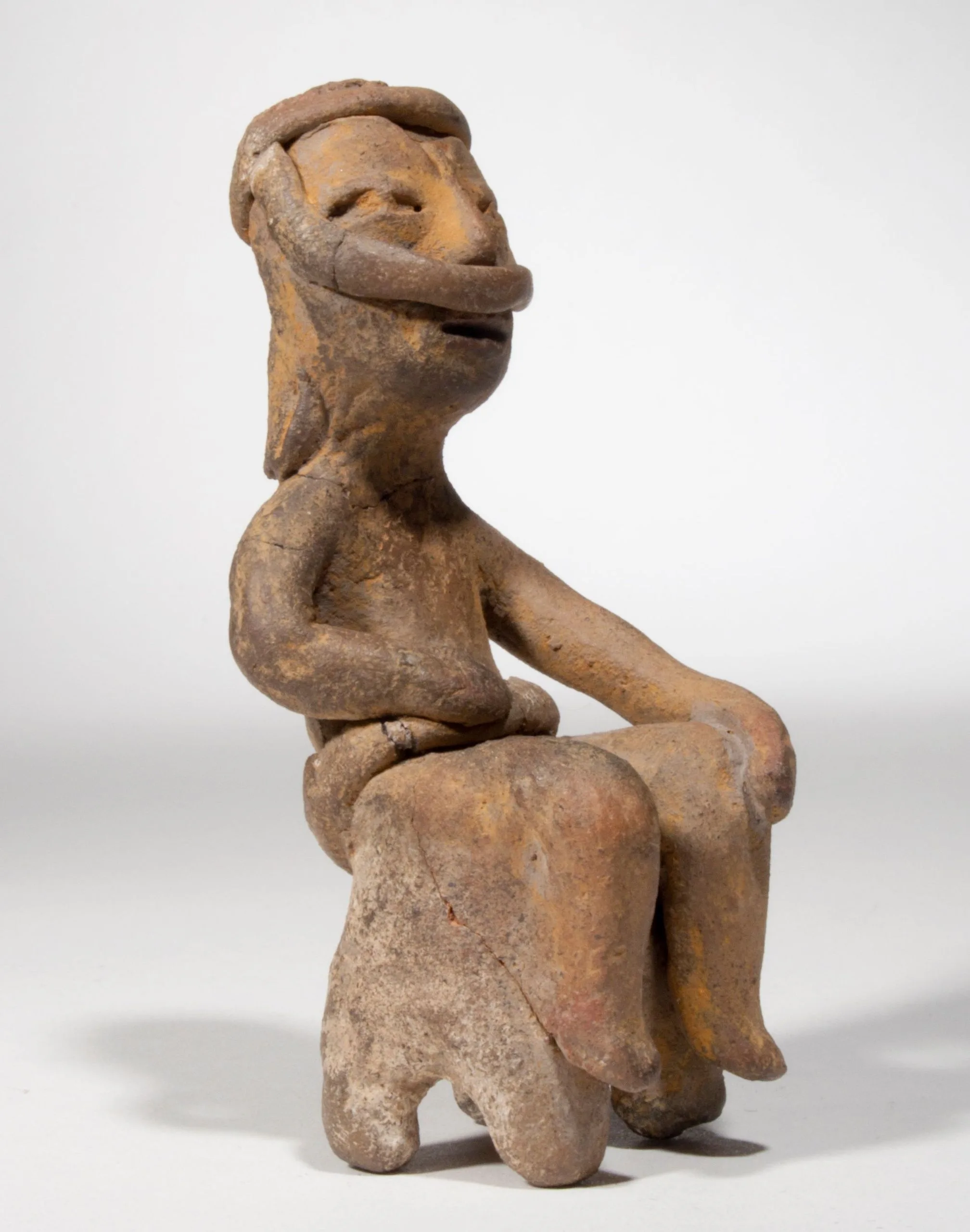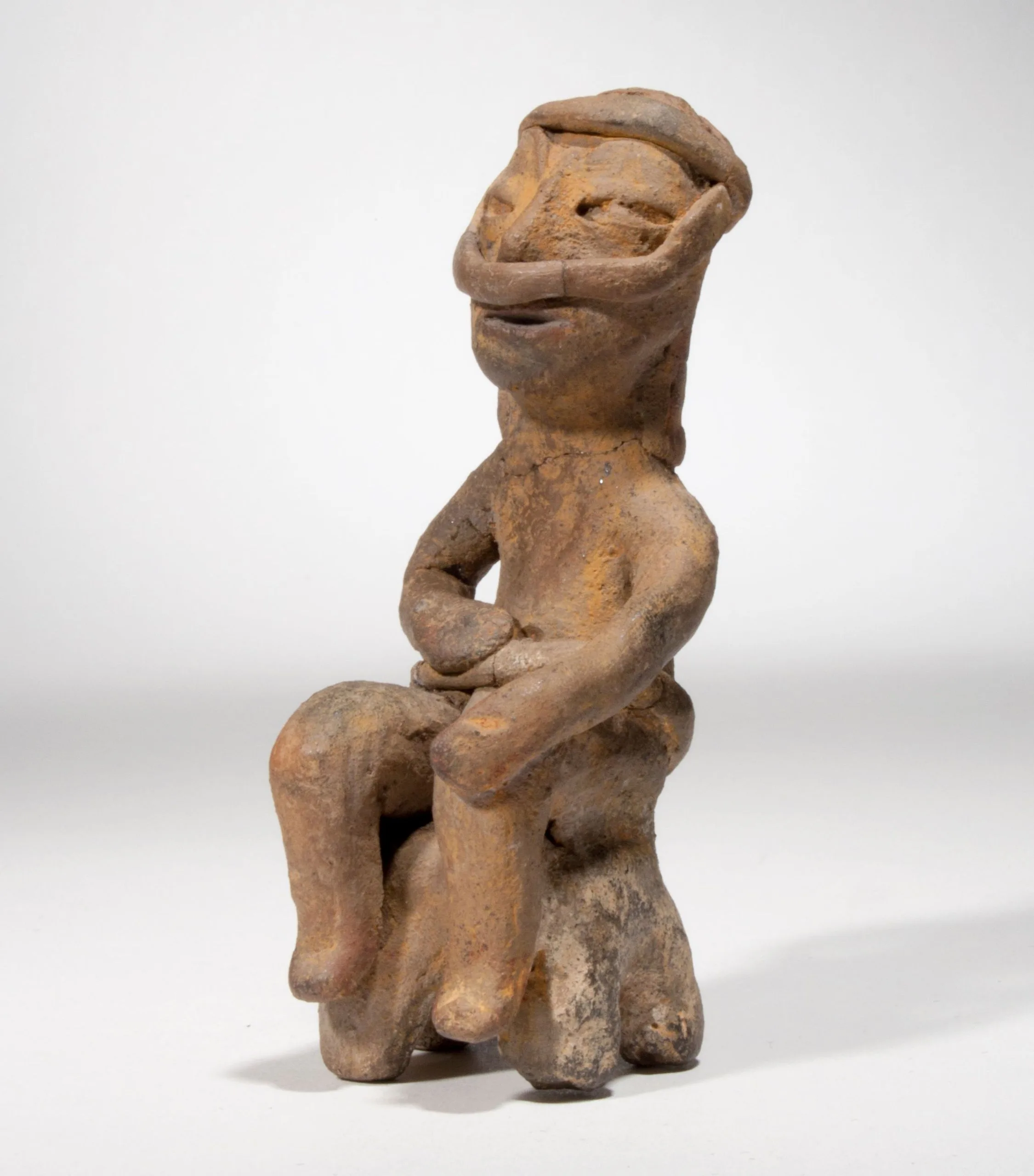 - Figure Seated on a Stool with Chin Strap and One Hand in Lap and One on Knee