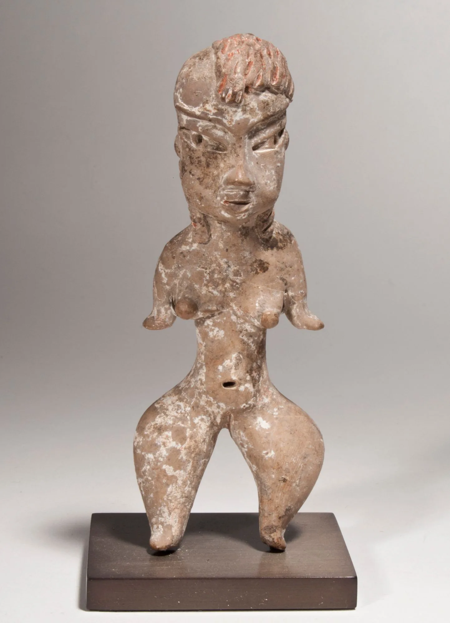 - Standing Female Figure with Central Head Crest and Shoulder Length Braids