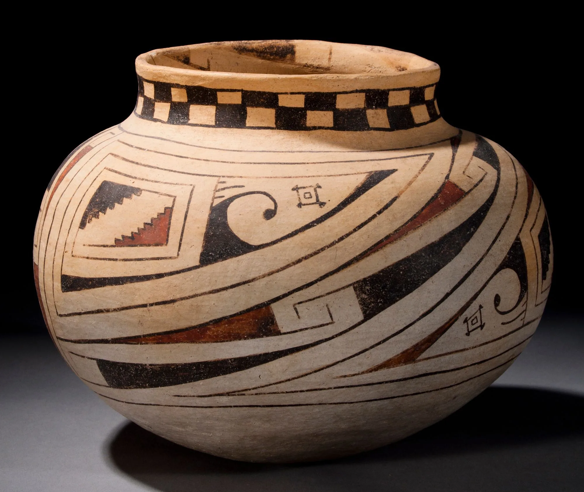 - Polychrome Jar with Parrot Head & Checkerboard Design