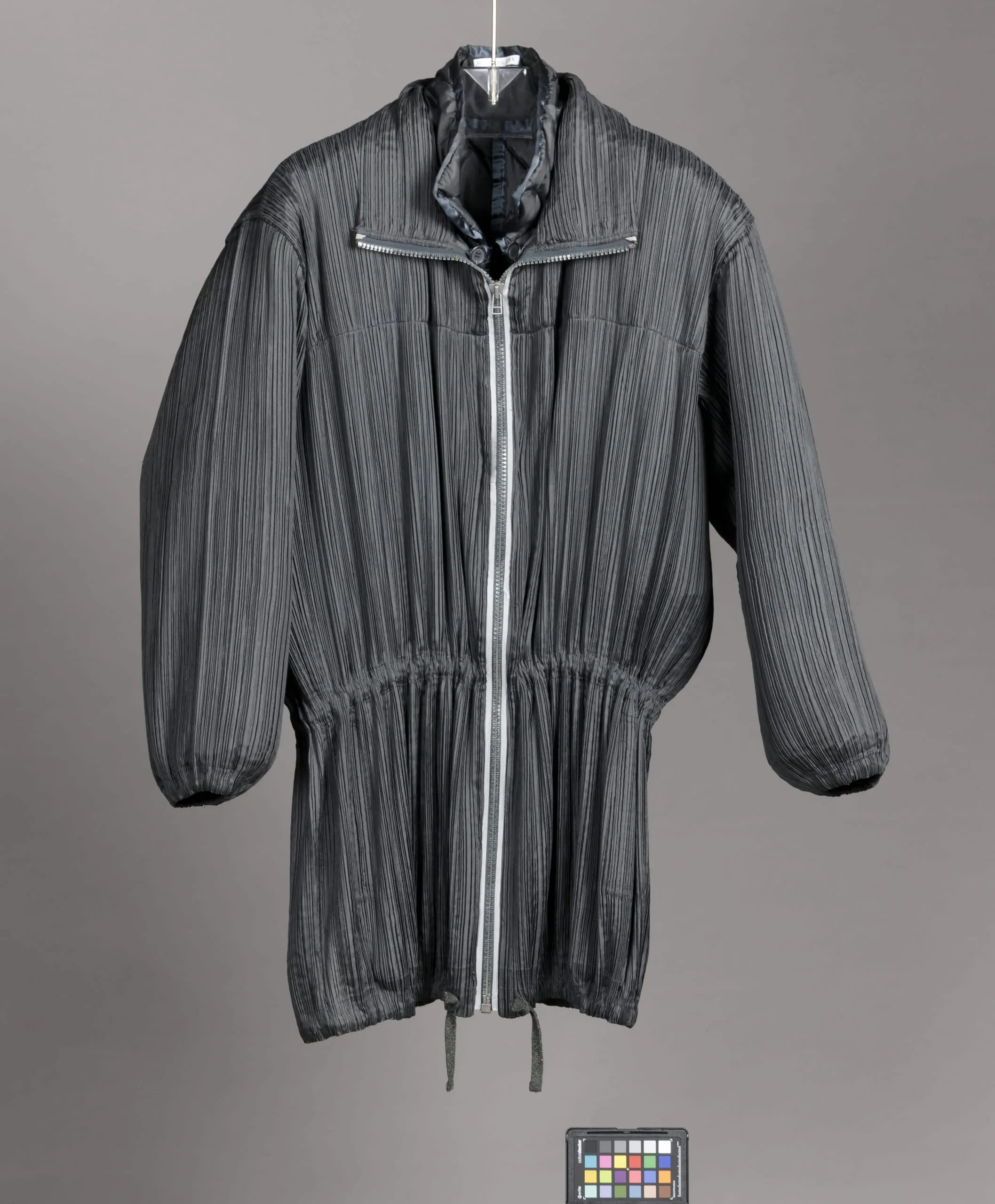 - Coat: Polyester plain weave, heat- and pressure- set pleated, with plastic zipper