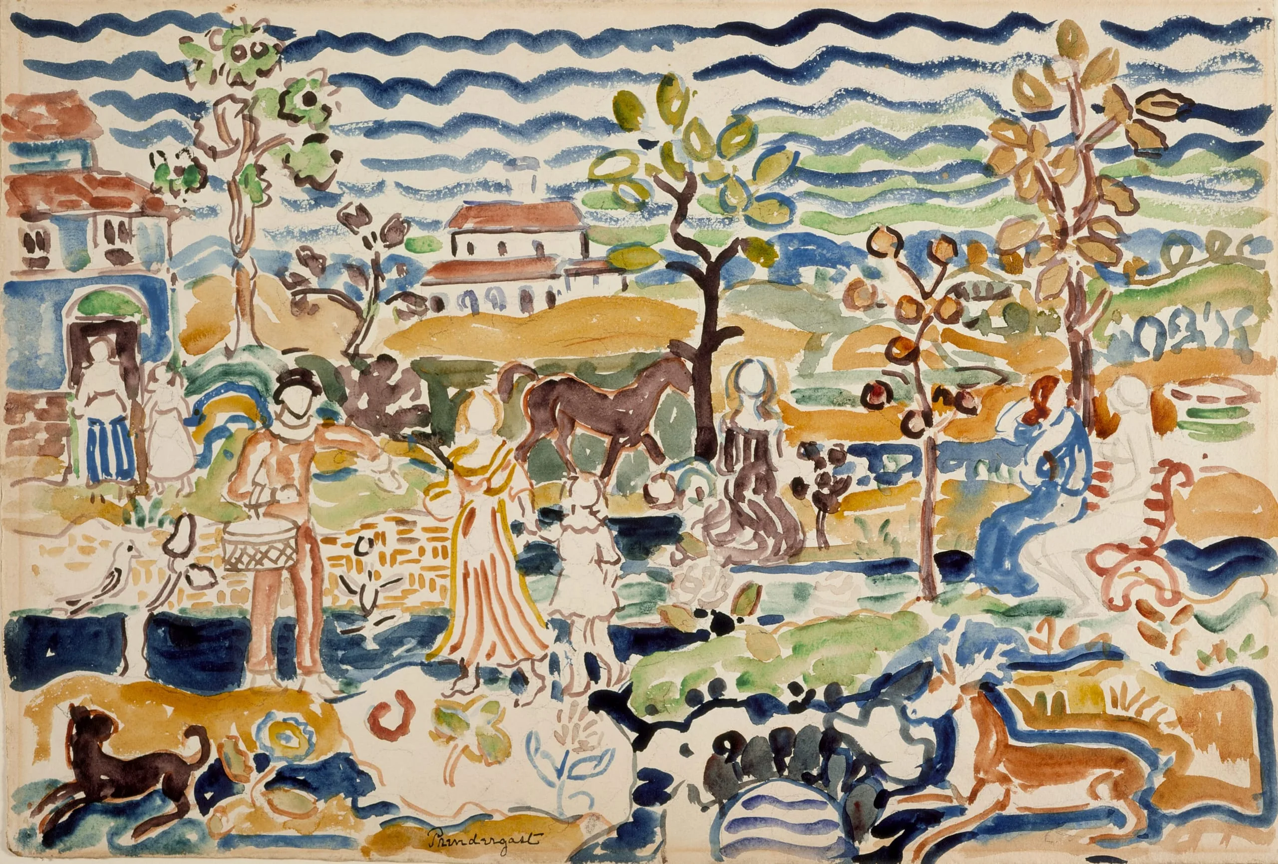 Art historian Eleanor Green suggests that the unusual style and period costumes worn by the figures may have been stimulated by the Prendergast brothers’ set designs for the King-Coit Children’s Theater group in New York. Unfortunately the designs for these sets are lost. Soon after completing this watercolor, Prendergast created two mural-size canvases that also reveal experimental brushwork with shorter, more mosaiclike strokes and a similar exploitation of the white of unpainted areas (Picnic, 1914-15, Carnegie Museum of Art, Pittsburgh; Promenade, 1914-15, Detroit Institute of Art).