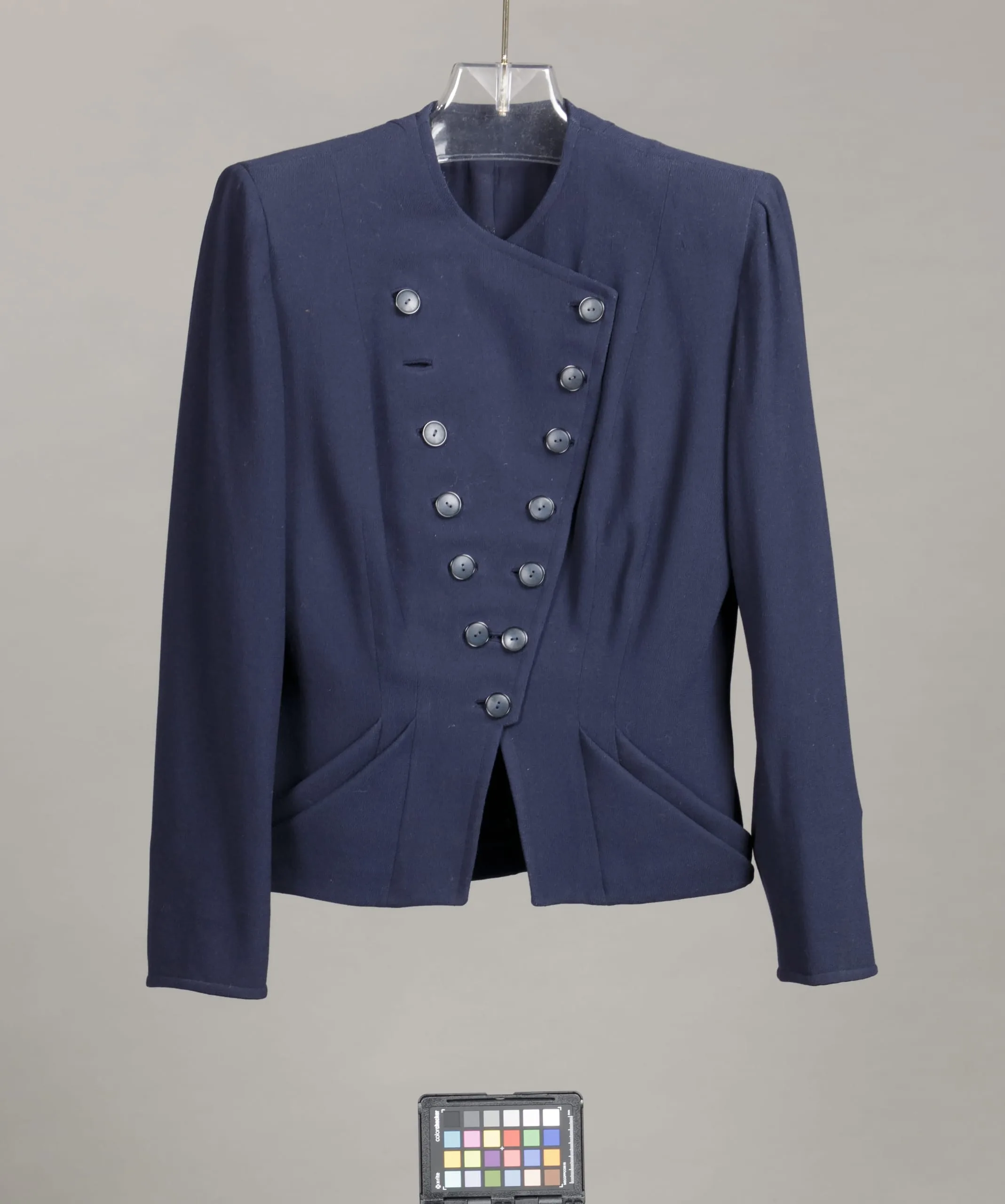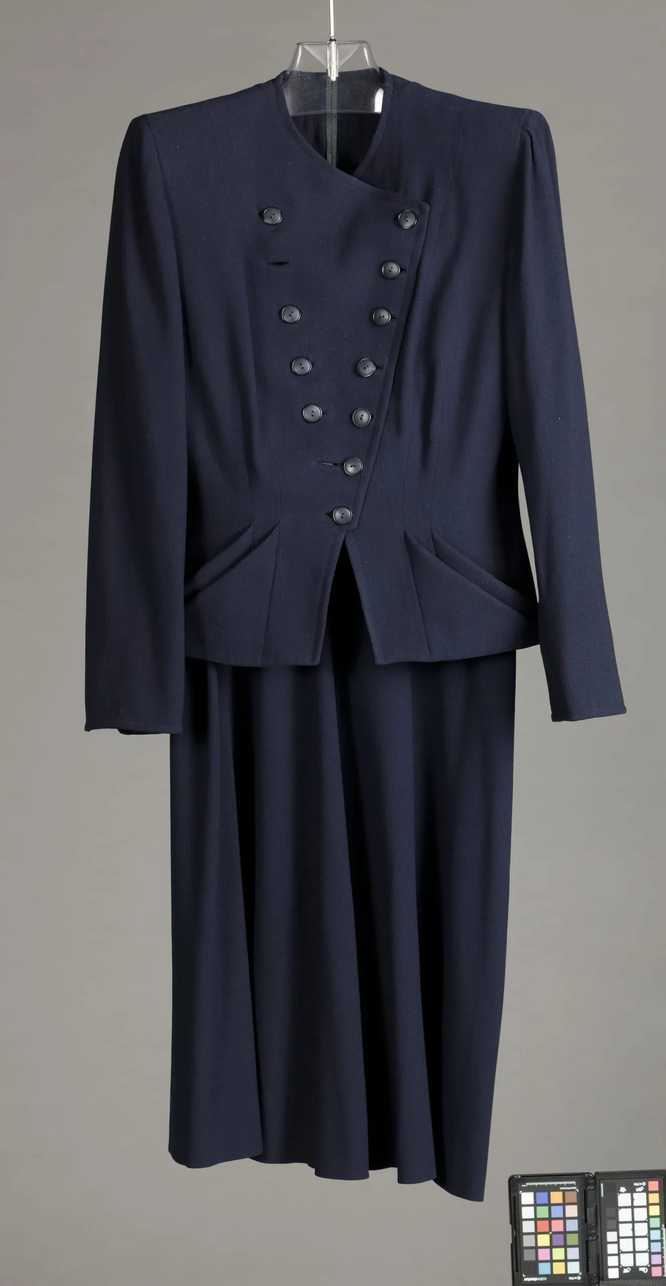 - Jacket: wool plain weave (crepe) with plastic buttons; Skirt: wool plain weave (crepe); Belt: wool plain weave (crepe) with metal