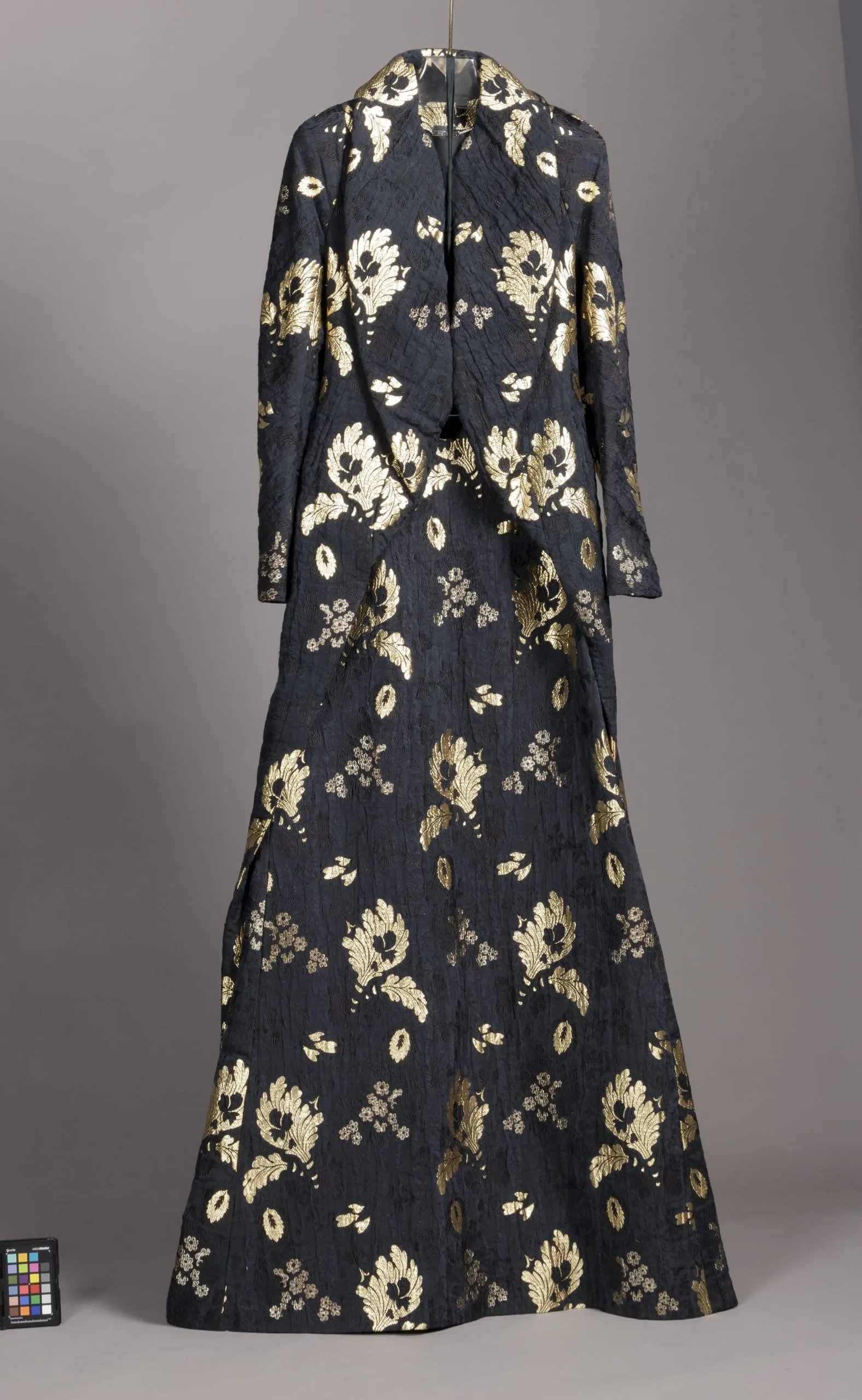 - Jacket and Skirt: Silk and metallic-thread double weave (matelassé)