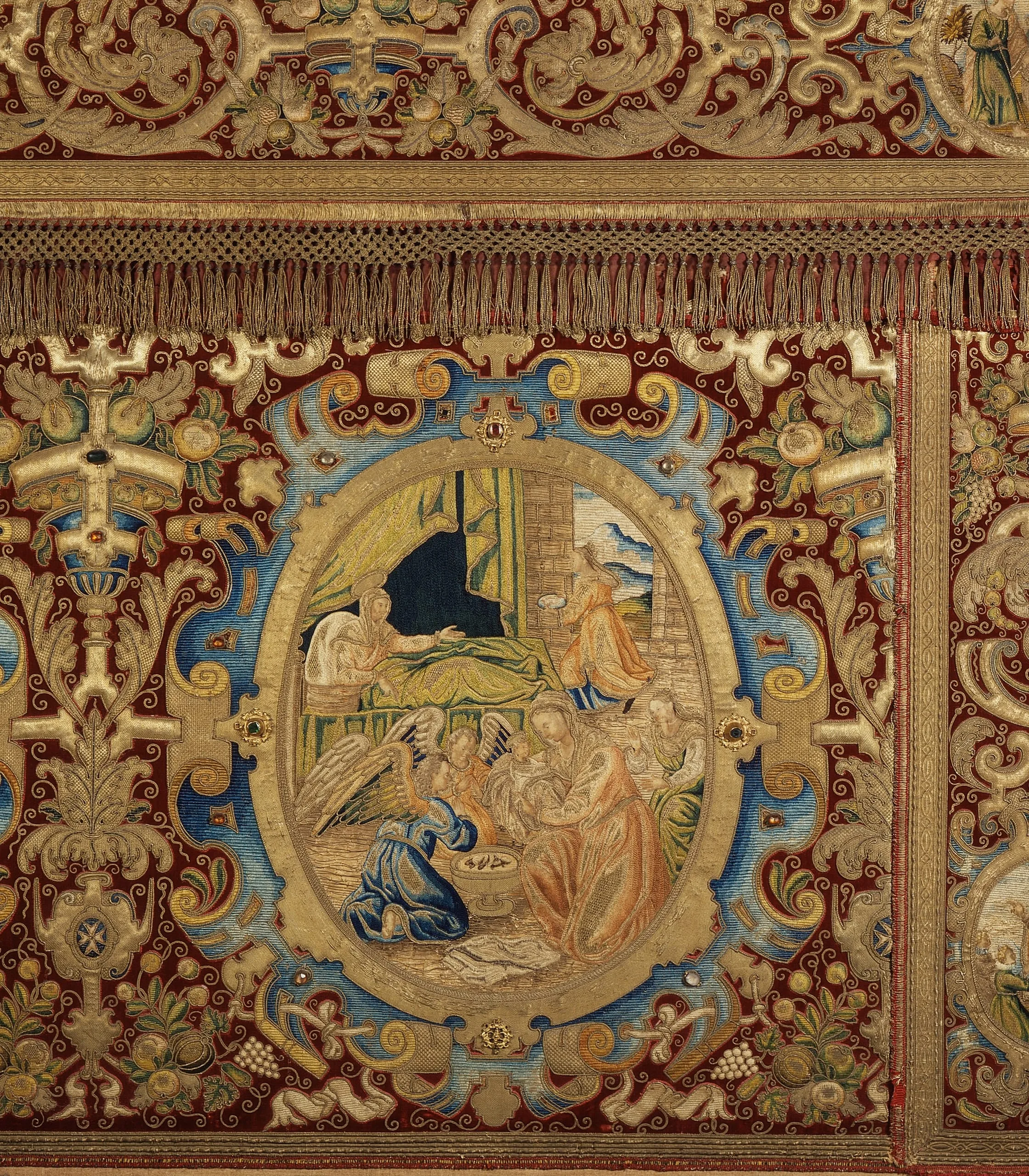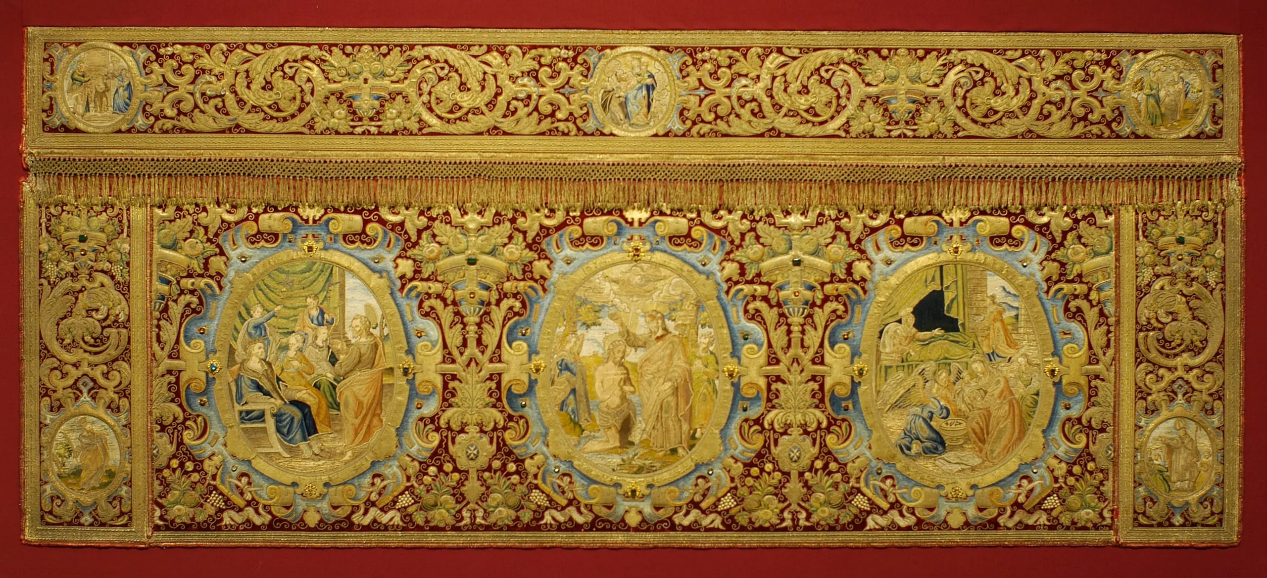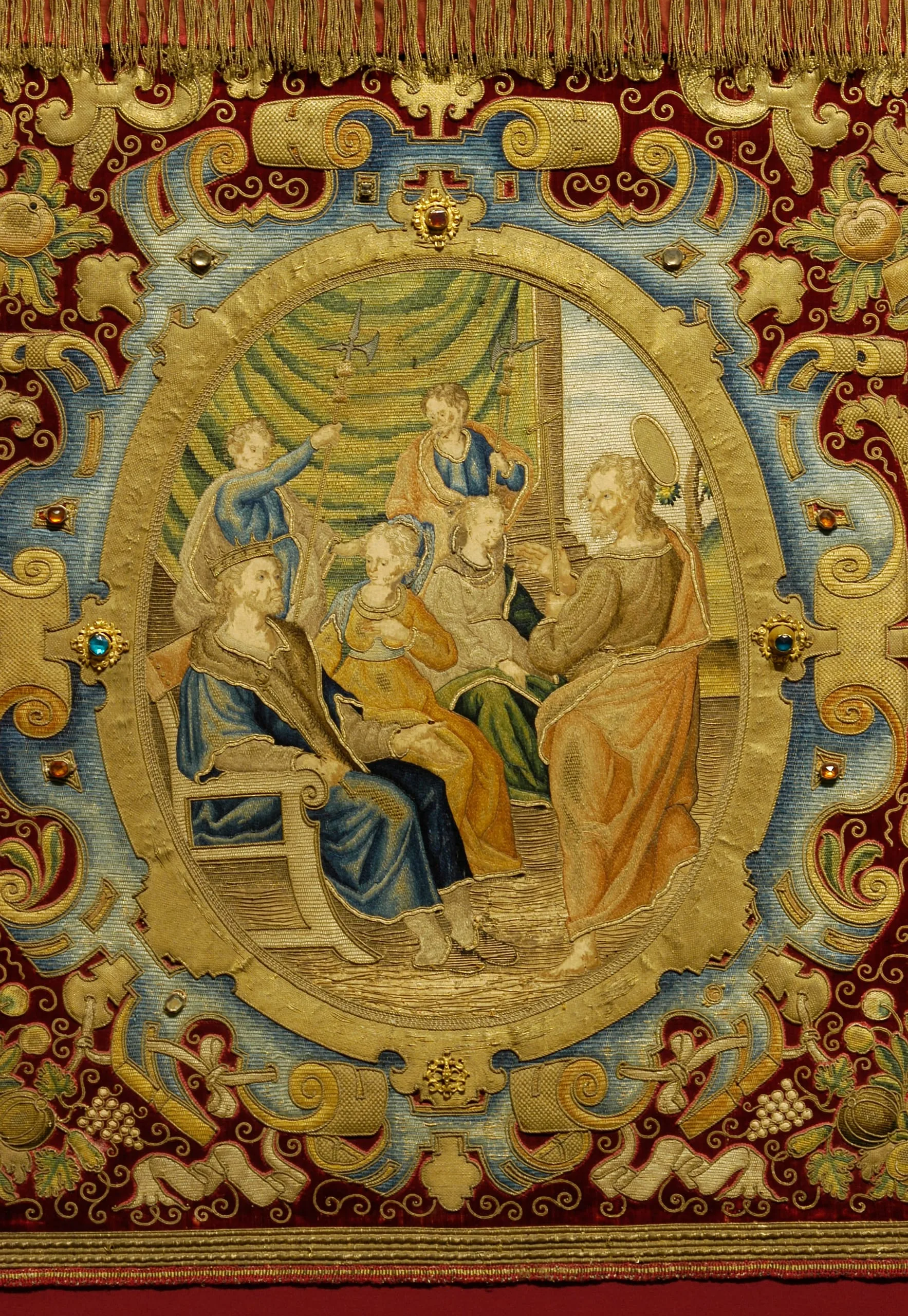 These primary scenes, framed by gemstones set in the borders, are surrounded by five smaller medallions. Four have iconic themes, but the lower right depicts a Maltese bishop blessing the donors of this altar frontal, emphasizing the fact that it was made for a particular chapel. It is not certain that the altar frontal was actually made in Malta; it may have been commissioned in Italy or even Spain in order to obtain the skills of a professional embroidery workshop equal to the elaborate task.