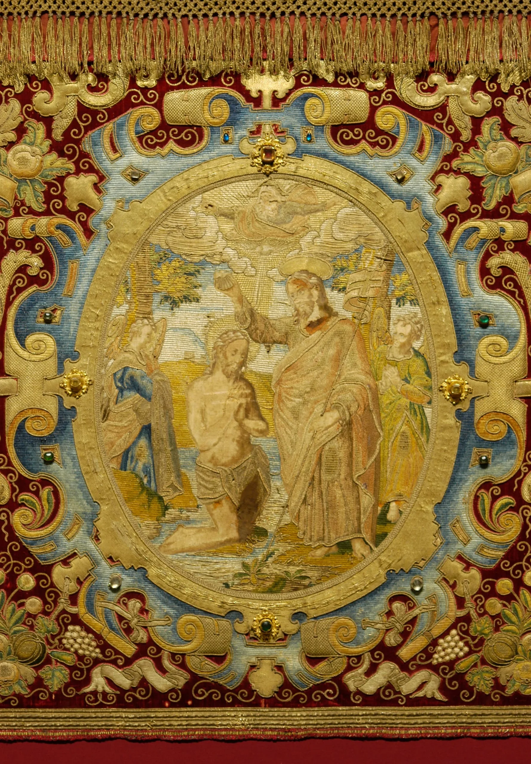 This elaborate altar frontal was made for the church of Valletta dedicated to John the Baptist on the island of Malta. The frontal bears three large medallions with scenes from the saint's life. At right, John is born, a scene combining, with typical Renaissance sensibility, homely detail with spiritual significance: John's mother, St. Elizabeth, is attended by angels and by women who offer her sweetmeats. At center, Christ is baptized by John in the Jordan River. At left, John reproves King Herod, whose daughter, Salome, will later take revenge by demanding the saint's head, one of the New Testaments most famous episodes.
