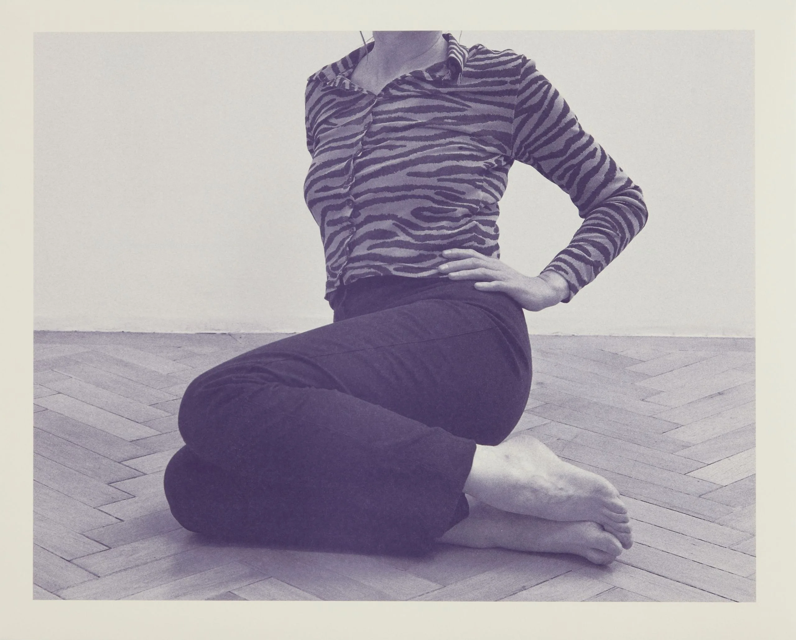 Lavender-toned black and white photograph of a headless figure seated on a herringbone parquet floor, wearing a zebra-stripe shirt and dark trousers, bare feet to the right
