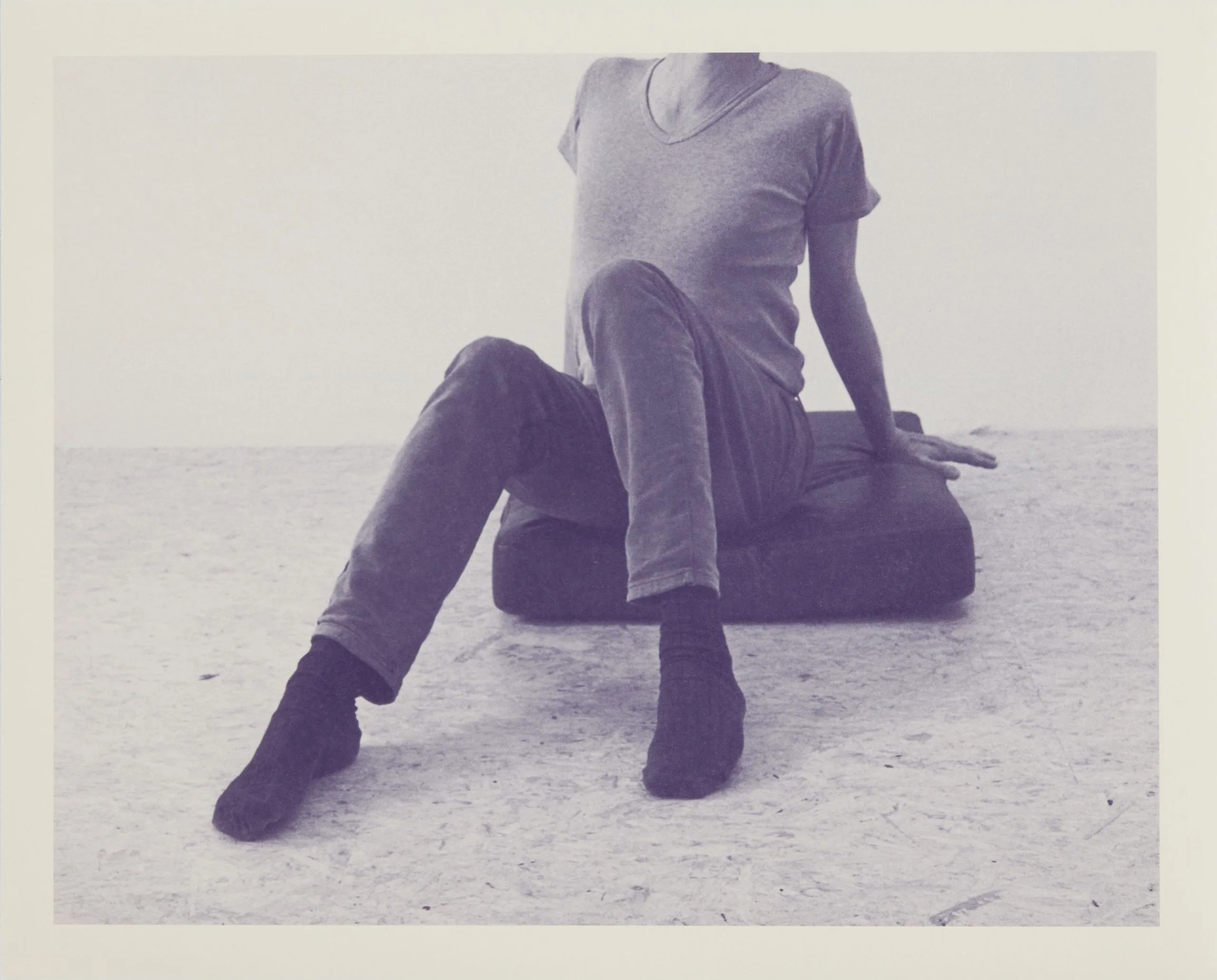 Duotone lavender-gray photograph, headless figure seated on a dark cushion outdoors, wearing a V-neck tee, trousers, and dark socks, cropped at the chest