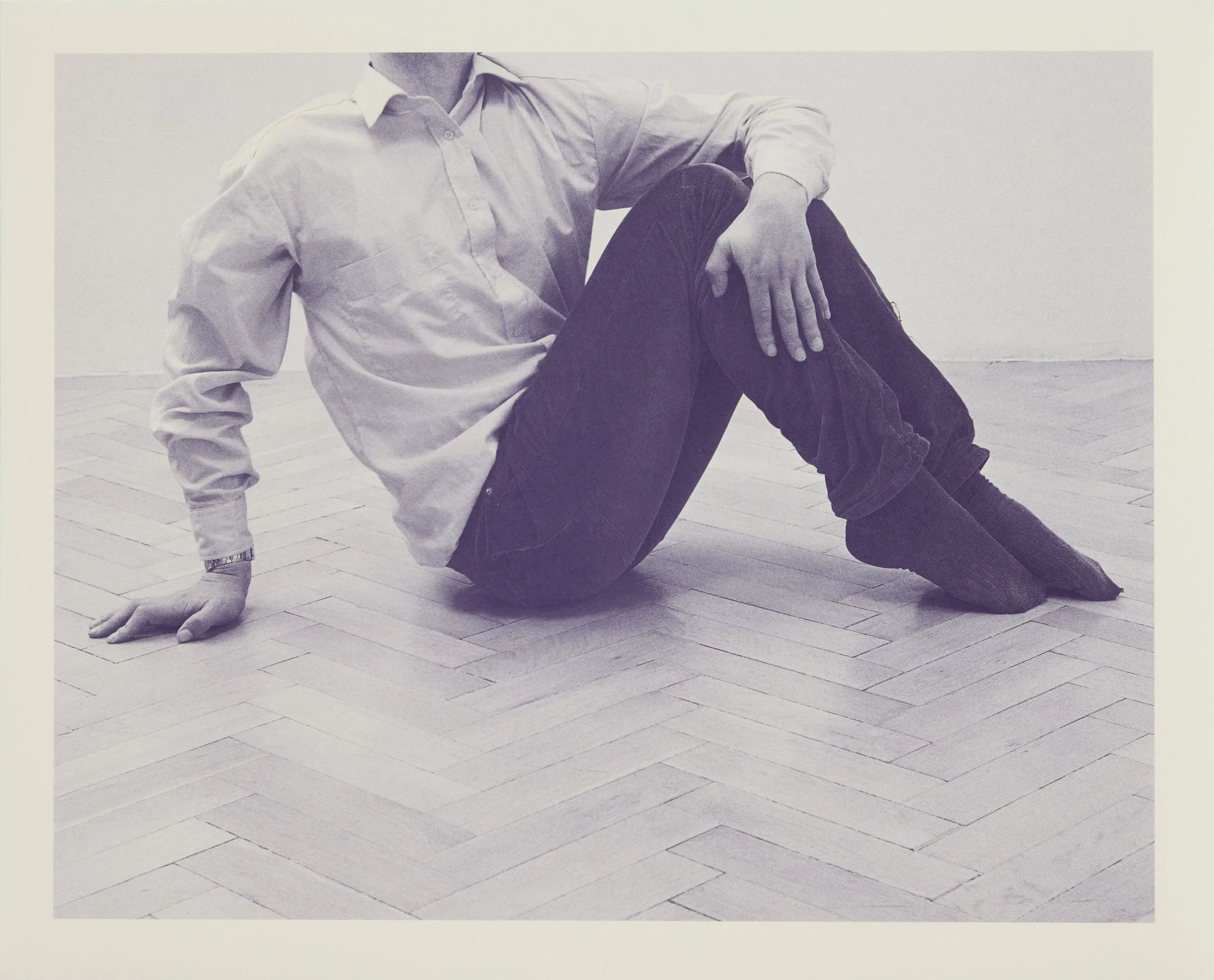 Cool-toned photograph of a seated figure in a pale button-down shirt and dark trousers on a herringbone wood floor, cropped at the neck