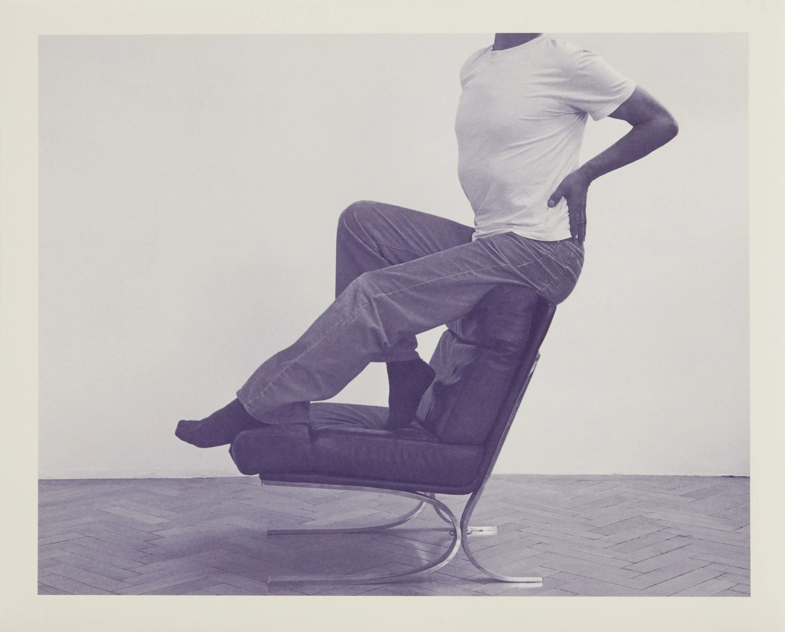 Cool-toned photograph of a headless seated figure in a white t-shirt and jeans on a dark leather lounge chair with a chrome base, shot against a gray wall