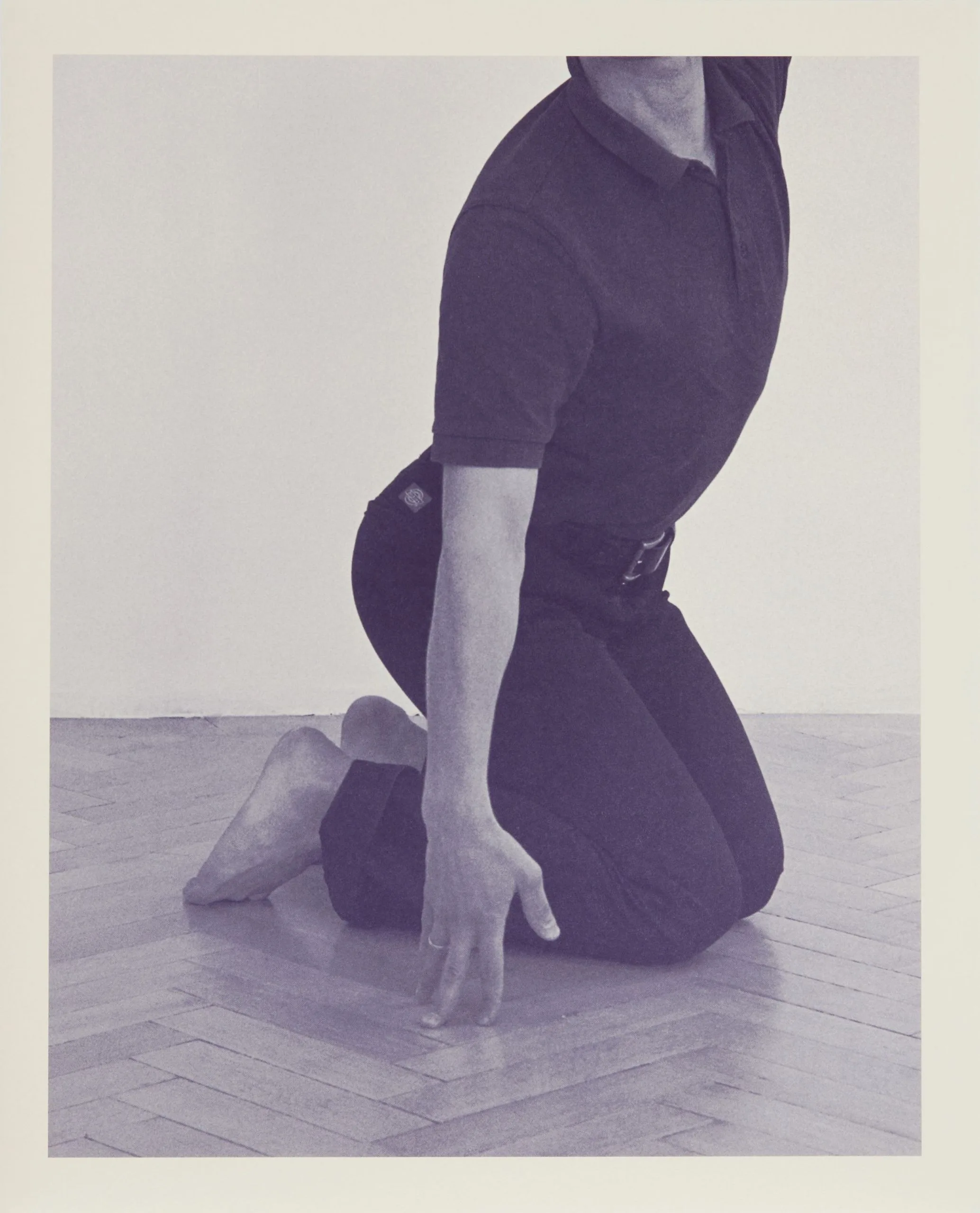 Cool-toned photograph of a kneeling figure in dark clothing, cropped at chin and toes, one hand hovering above a herringbone parquet floor