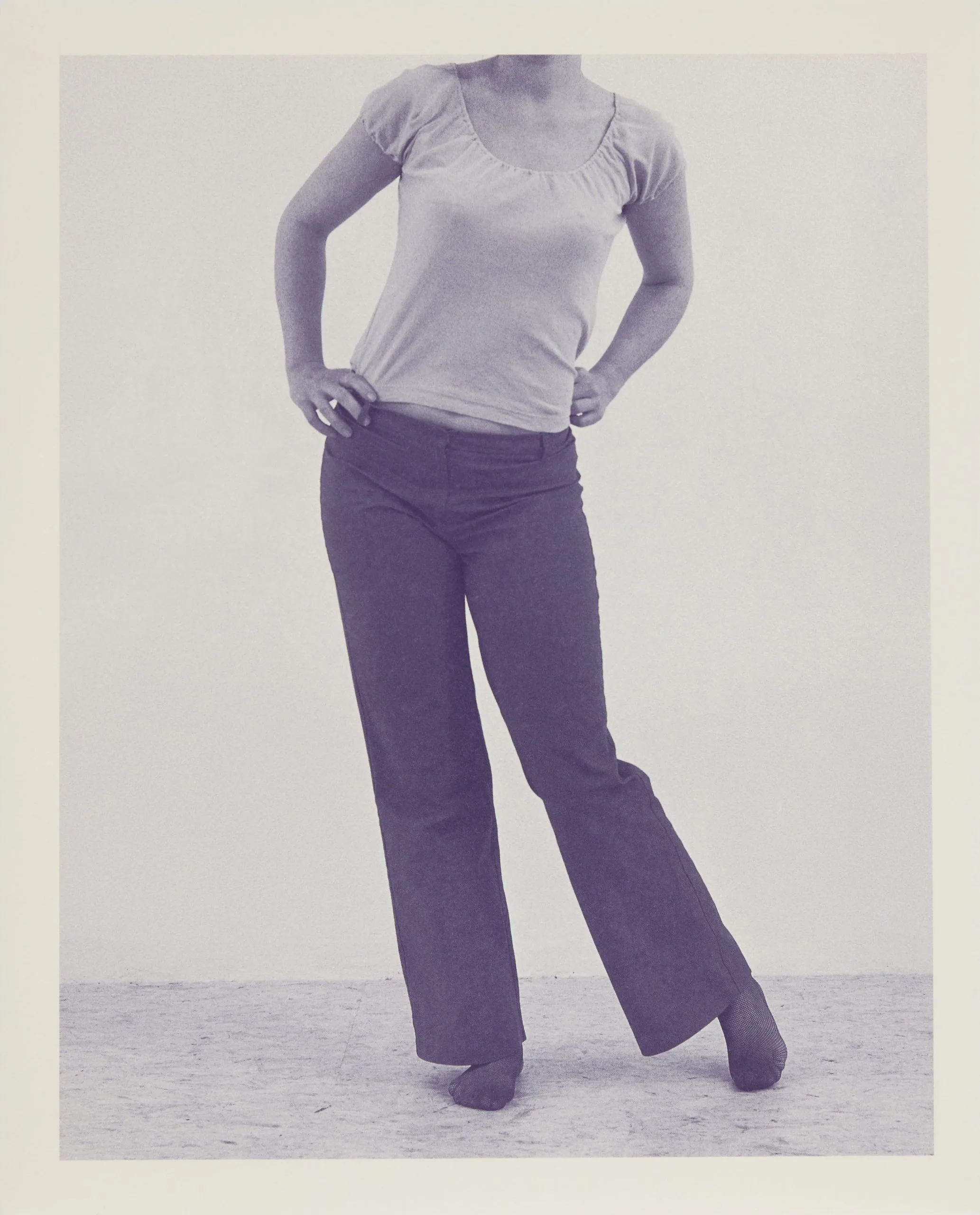 Duotone print in lavender-gray and off-white, headless female figure in wide-leg trousers, scoop-neck top, and platform shoes, hands on hips