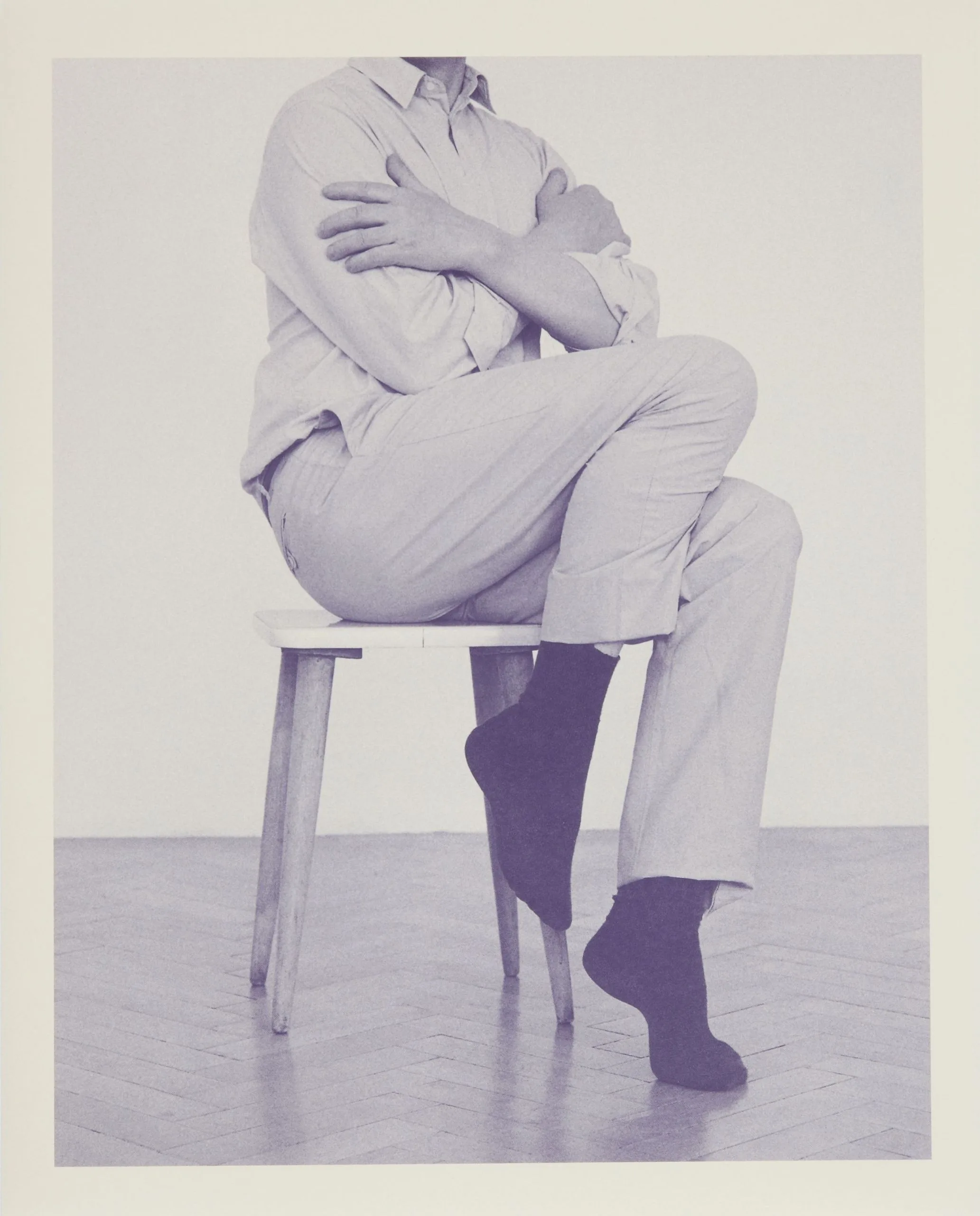 Lavender-toned print of a headless seated figure with crossed arms on a wooden stool, wearing a button-down shirt, trousers, and dark socks, on a herringbone wood floor