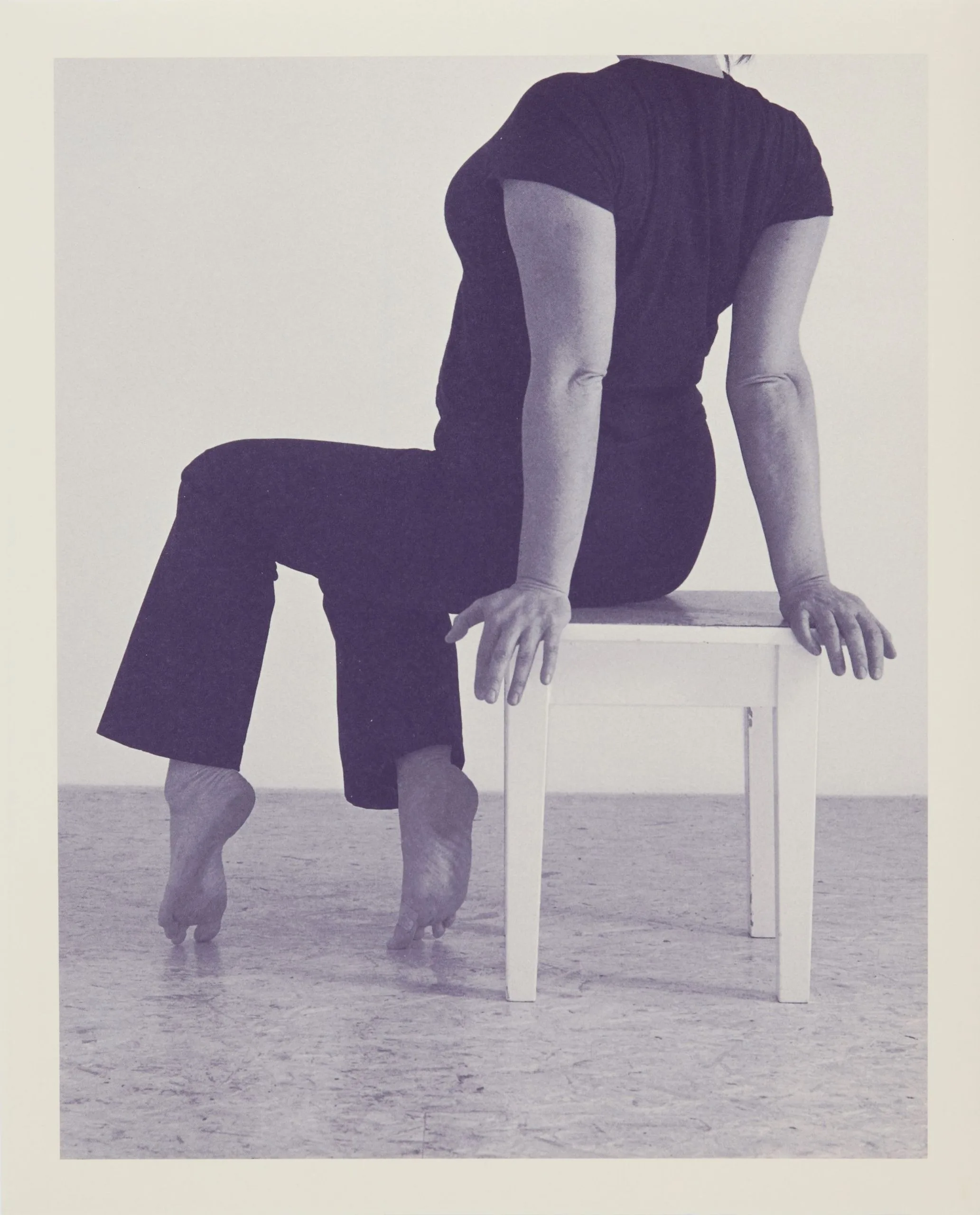 Blue-gray toned photograph of a headless seated figure in dark clothing, back to camera, bare feet hovering above the floor, gripping a white stool