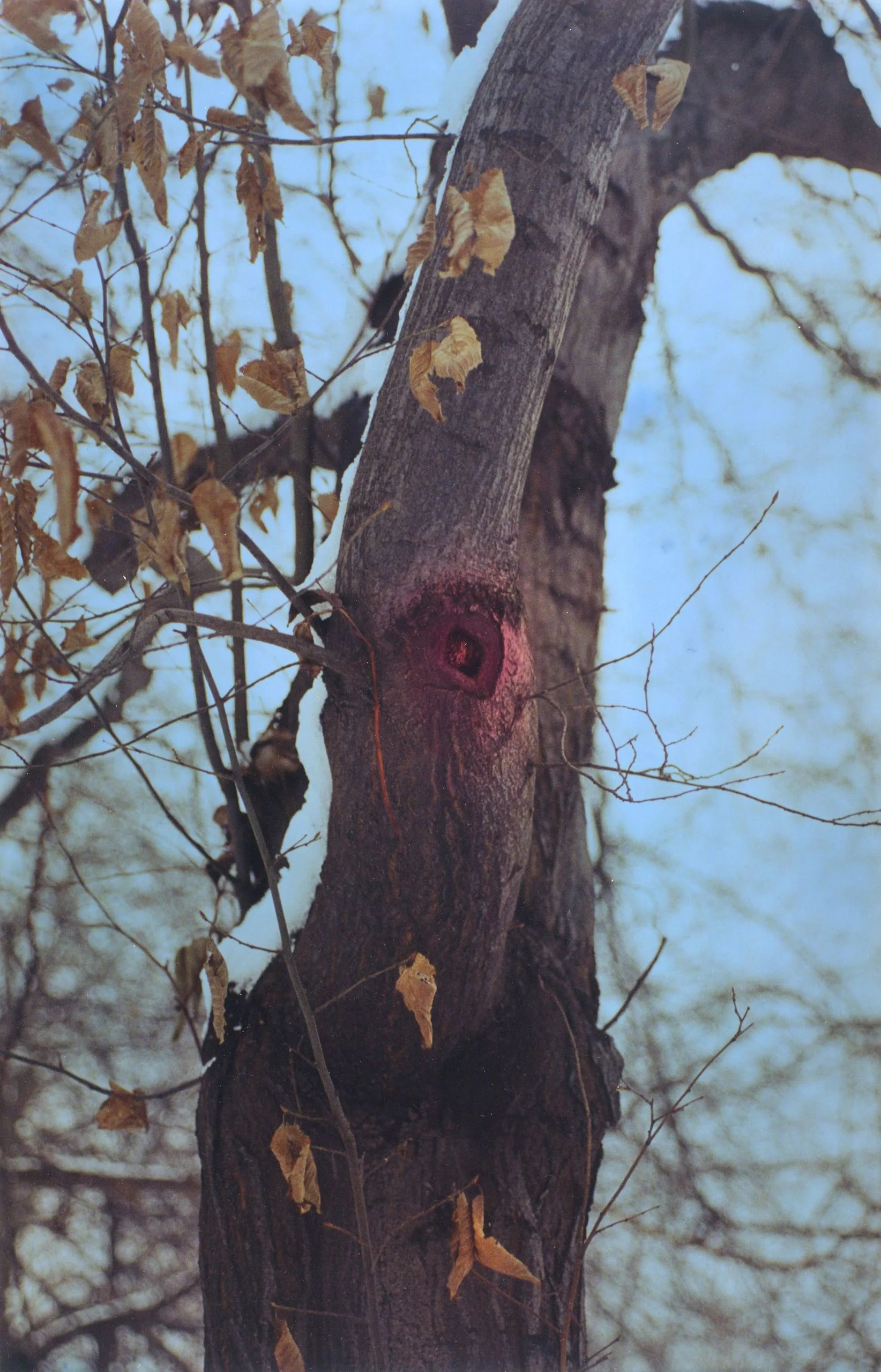 Color photograph of a gray-brown tree trunk with a circular knot painted vivid red, surrounded by bare branches with dry honey-yellow leaves against a pale blue sky
