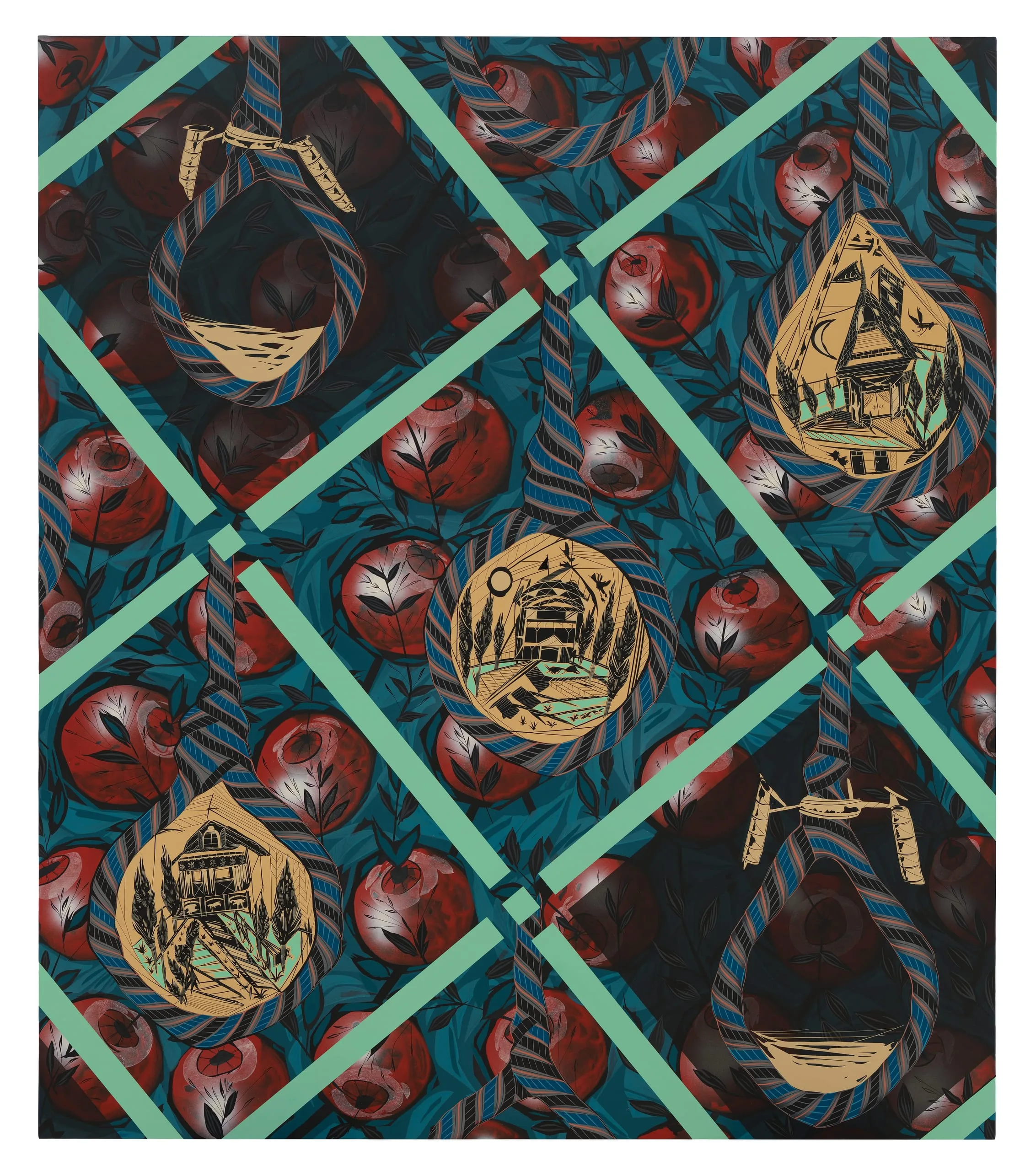 The imagery of Portrait of a Textile (Damask) includes pomegranates, a fruit that originated in the ancient Near East, was introduced into Spanish America in the late sixteenth century and into California in the eighteenth century (thus combining aspects of Pittman’s personal heritage—his mother was Colombian, and he was born, educated, and continues to work in Los Angeles). Nooses likewise figure prominently in the painting, perhaps alluding to contemporary social and political threats related not only to Syria and the Middle East but closer to home as well.