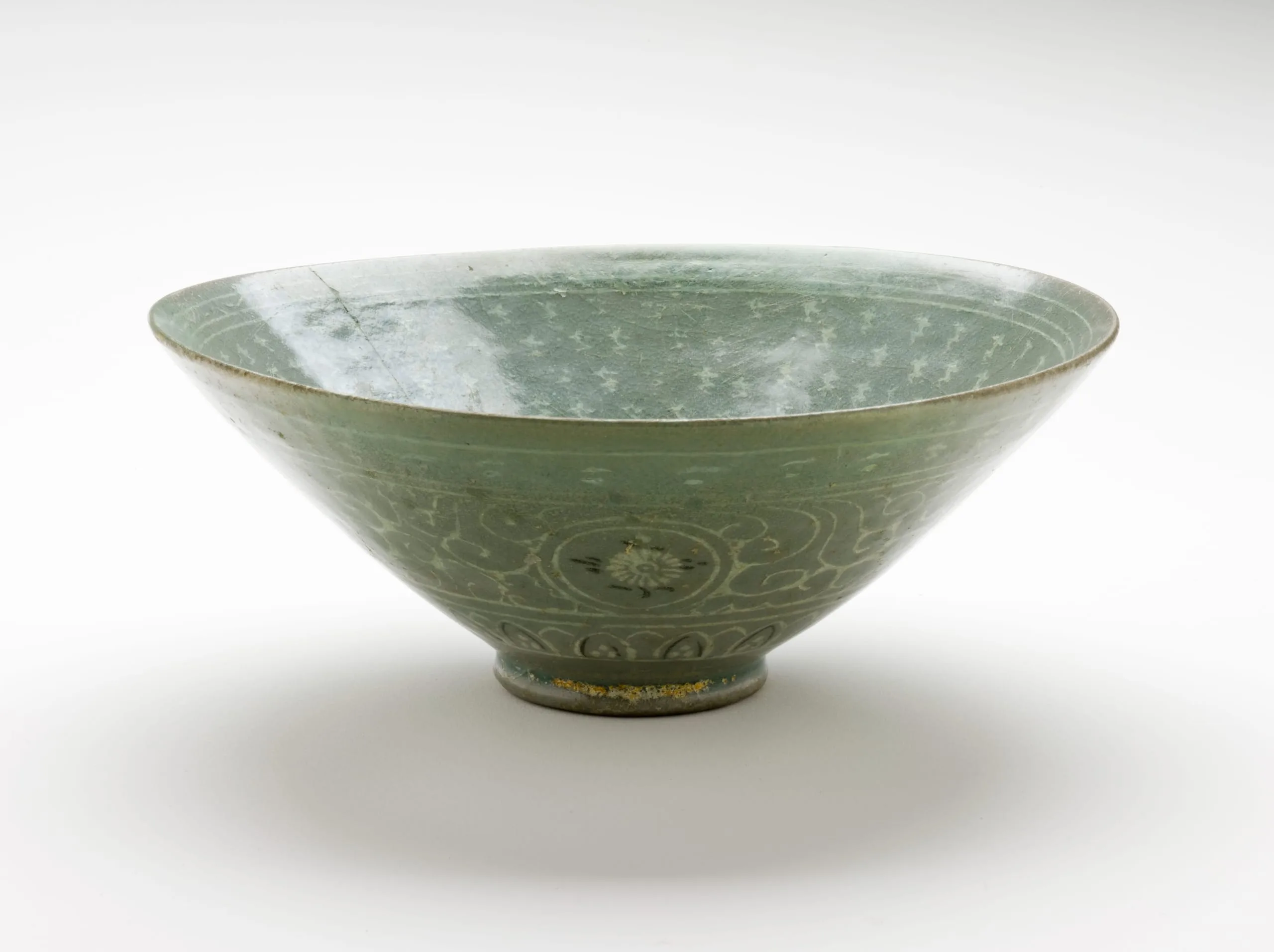- Wheel-thrown stoneware with incised and slip-filled decoration and green glaze