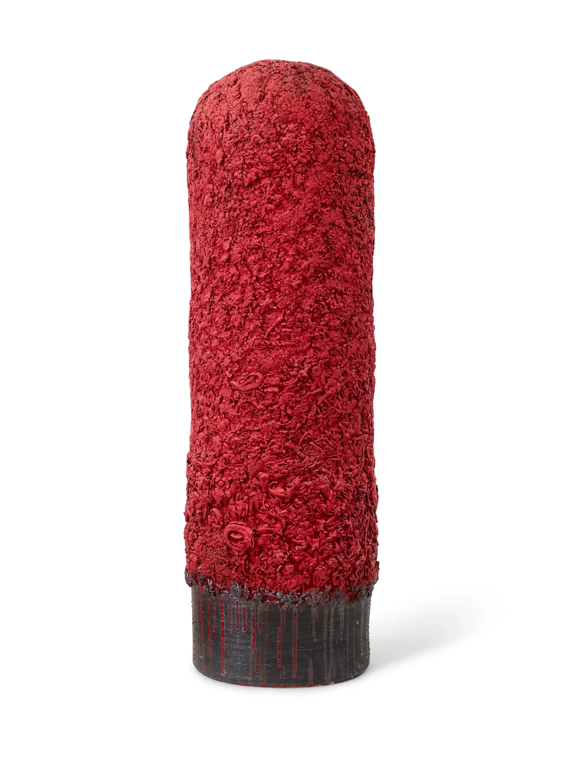 Tall cylindrical sculpture covered in dense crimson-red textured material over a smooth near-black base with red drips