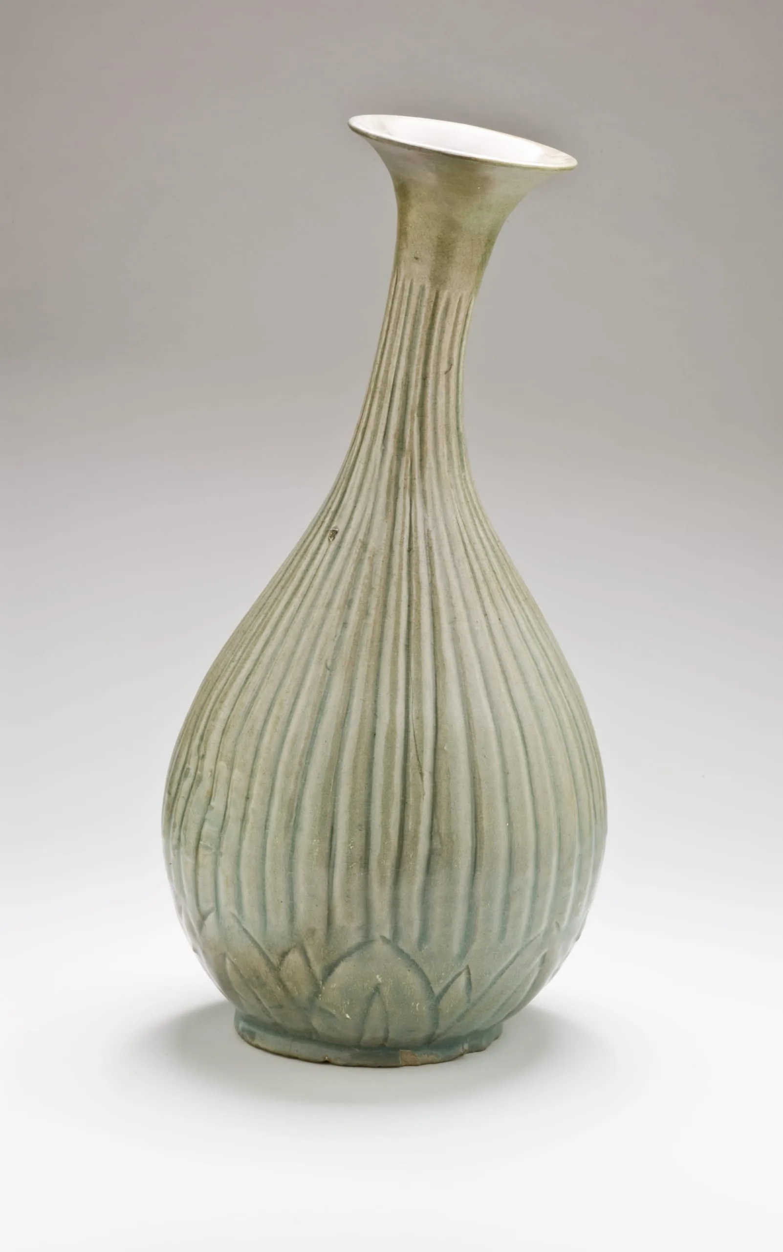 - Wheel-thrown stoneware with modeled and incised decoration and green glaze