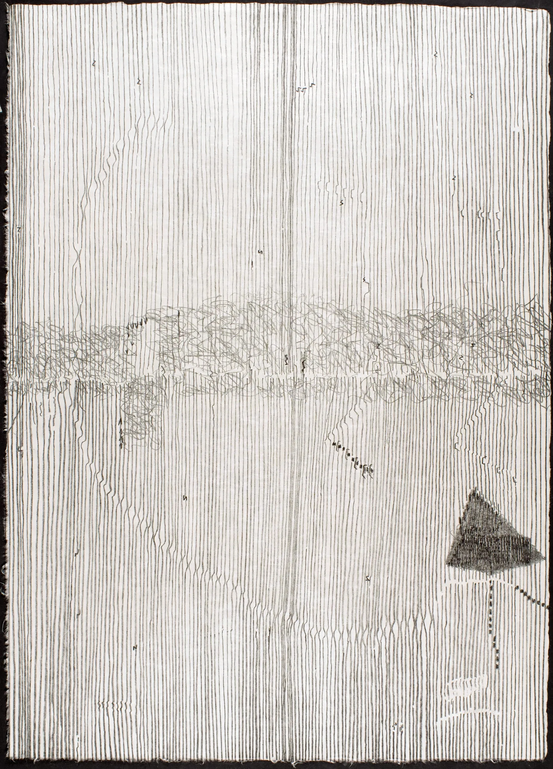 Drawing in graphite on white paper, covered in fine vertical lines with a dense band of scribbled marks across the middle and a solid dark triangle in the lower right