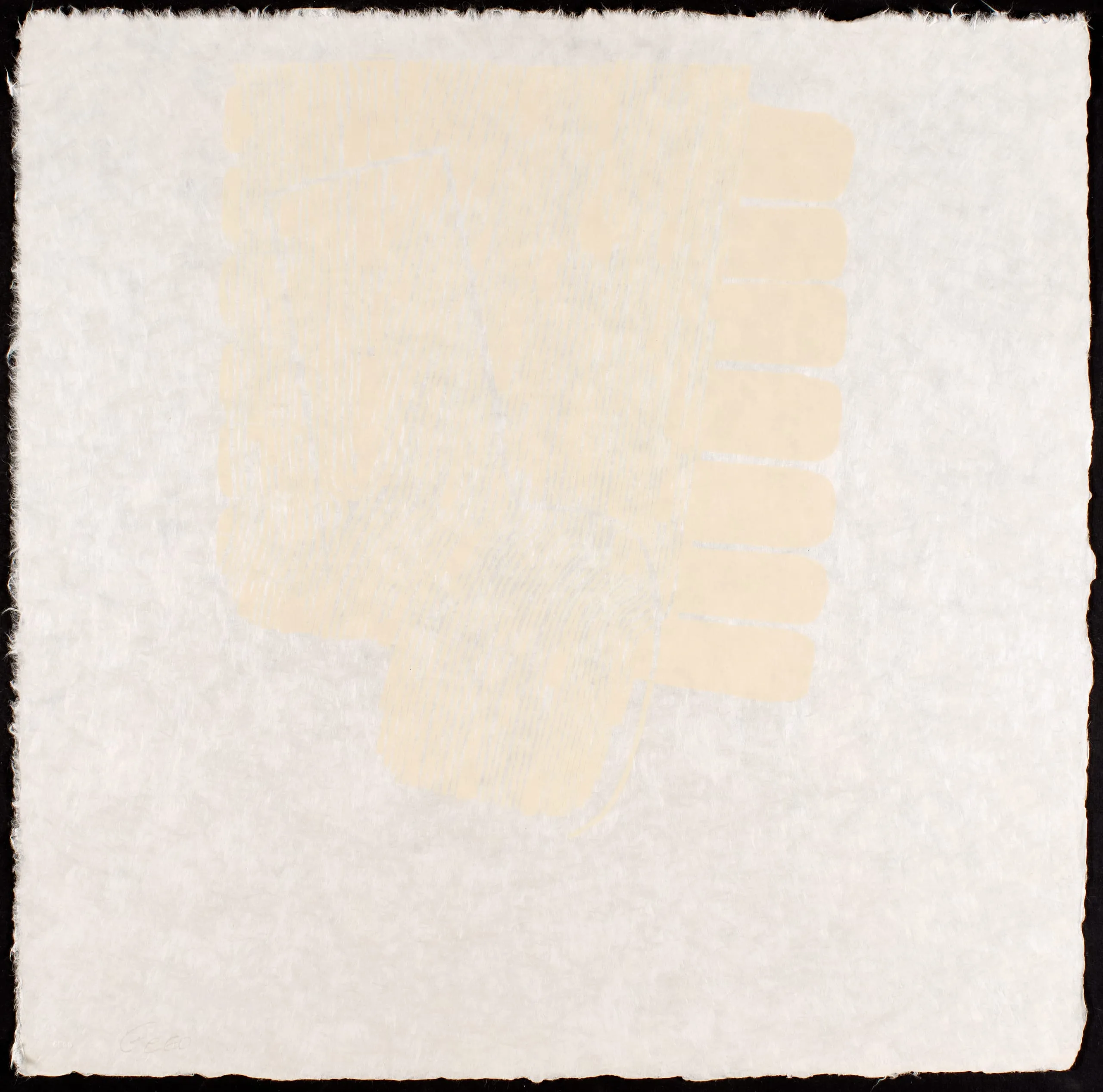 Abstract work on handmade paper with deckled edges, featuring a soft pale cream-yellow form with rounded rectangular shapes along its right edge against a white ground