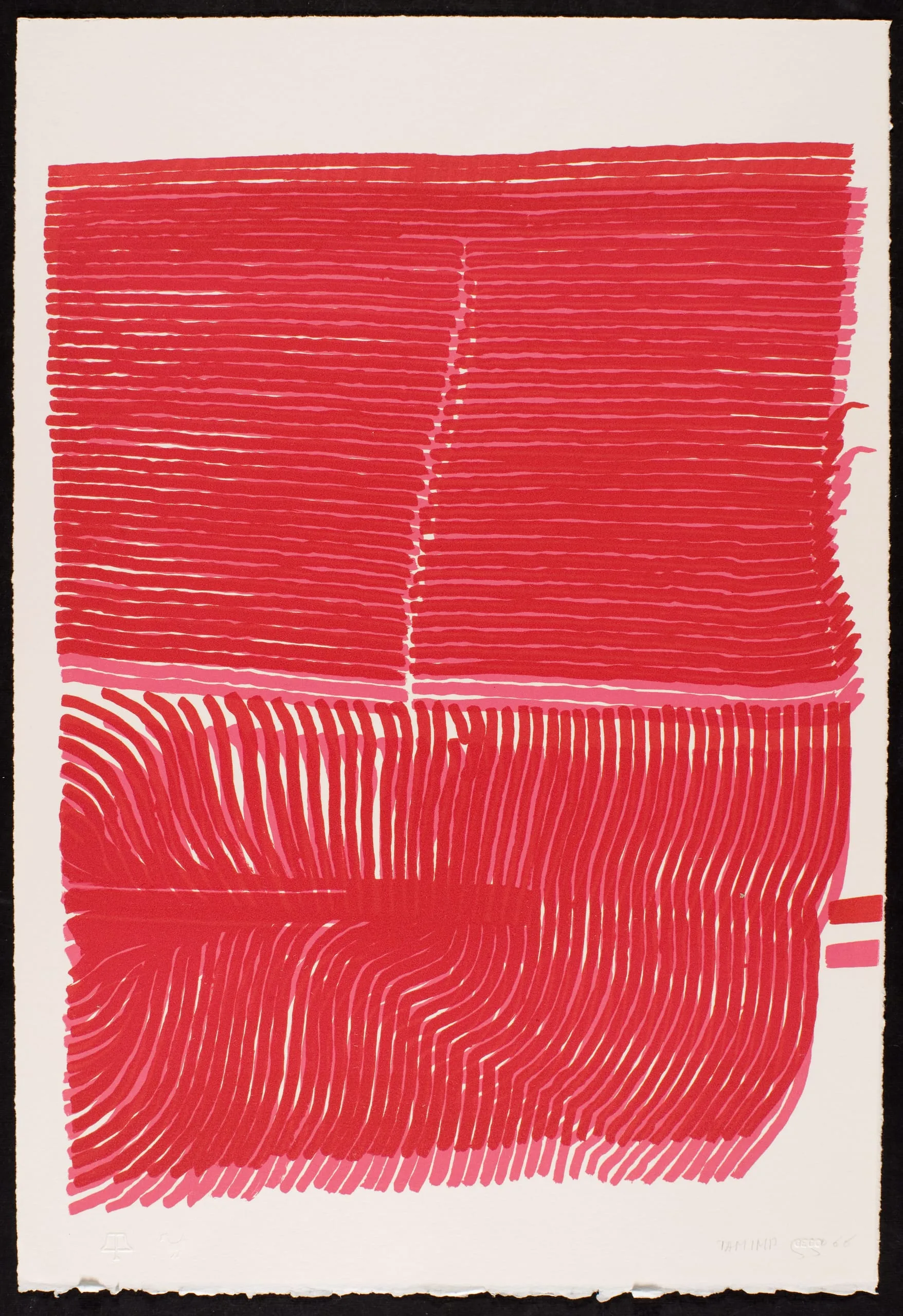 Abstract print with dense horizontal crimson lines in the upper half transitioning to curved vertical lines below, on cream paper with a hot-pink ground