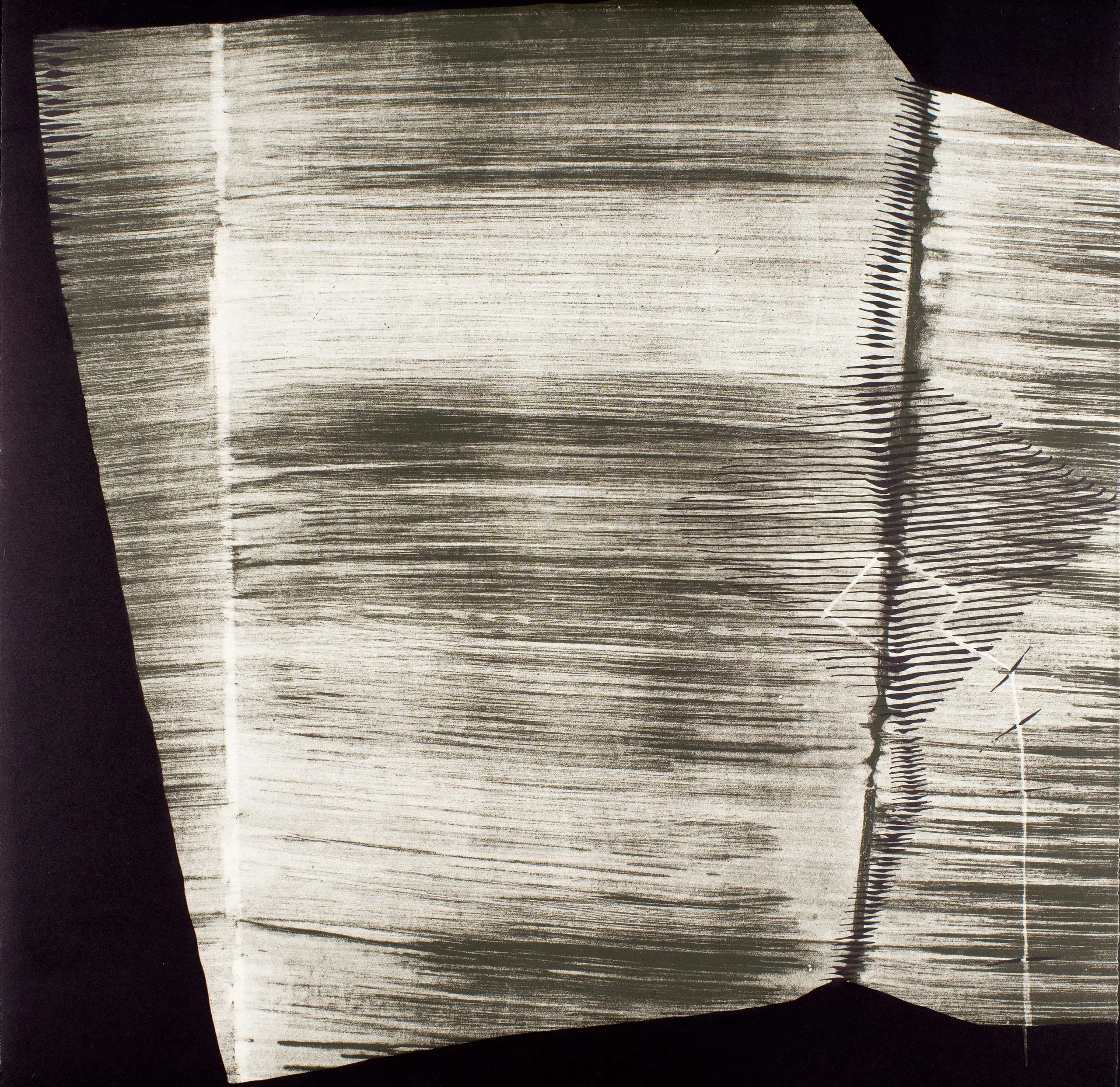 Abstract print with dense horizontal gray lines on two overlapping off-white sheets, with a jagged vertical column of comb-like marks along the right edge and a white diamond-shaped gap at center-right