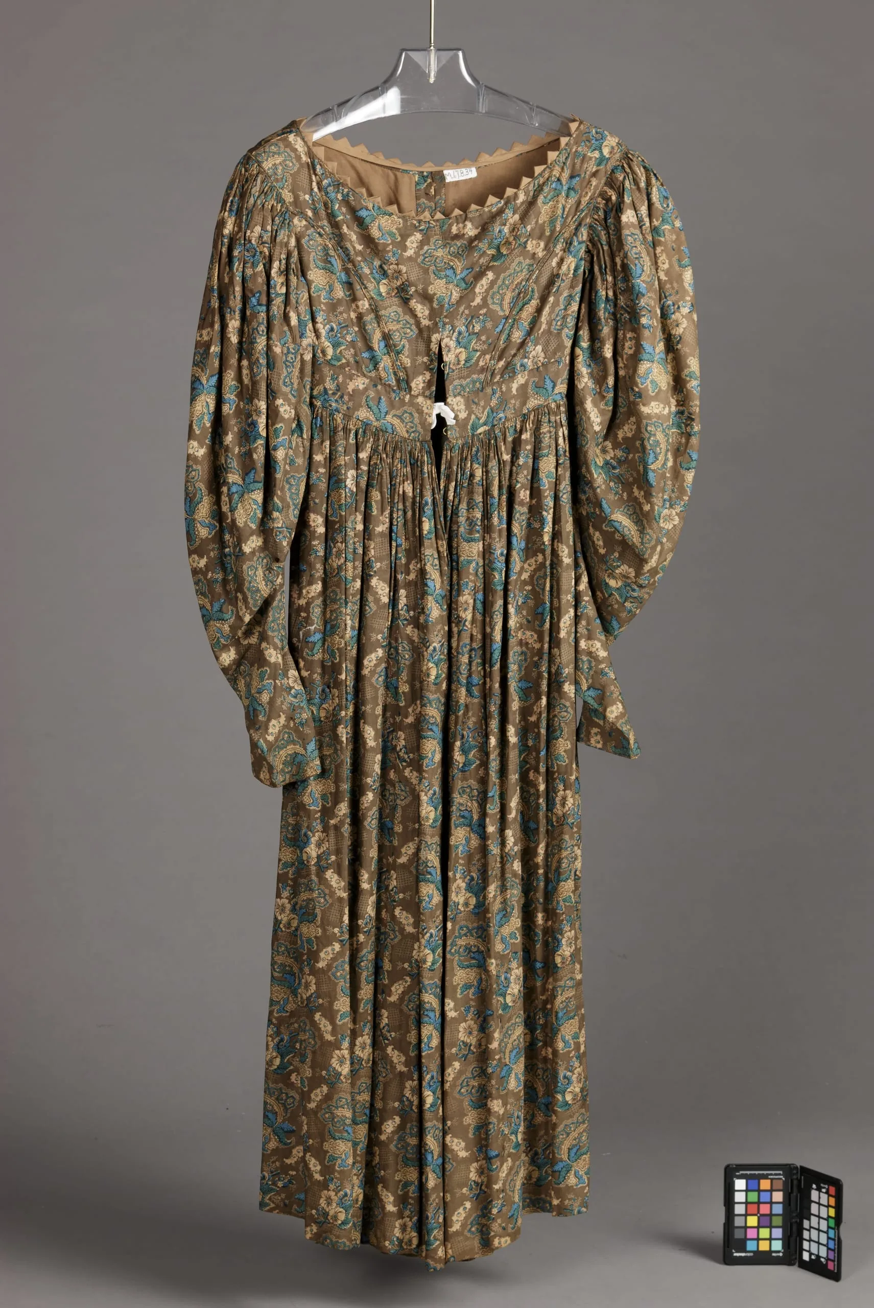 Full-length dress on a hanger, khaki-brown fabric with an allover teal, cream, and olive botanical print, balloon sleeves, and heavy skirt gathers