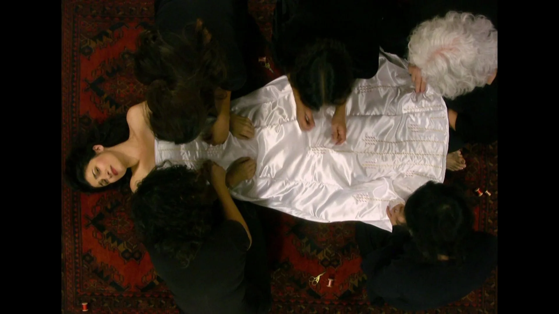 In Gazelle Samizay’s video Upon My Daughter, a young bride reclines on a carpet while a group of women collectively embroider