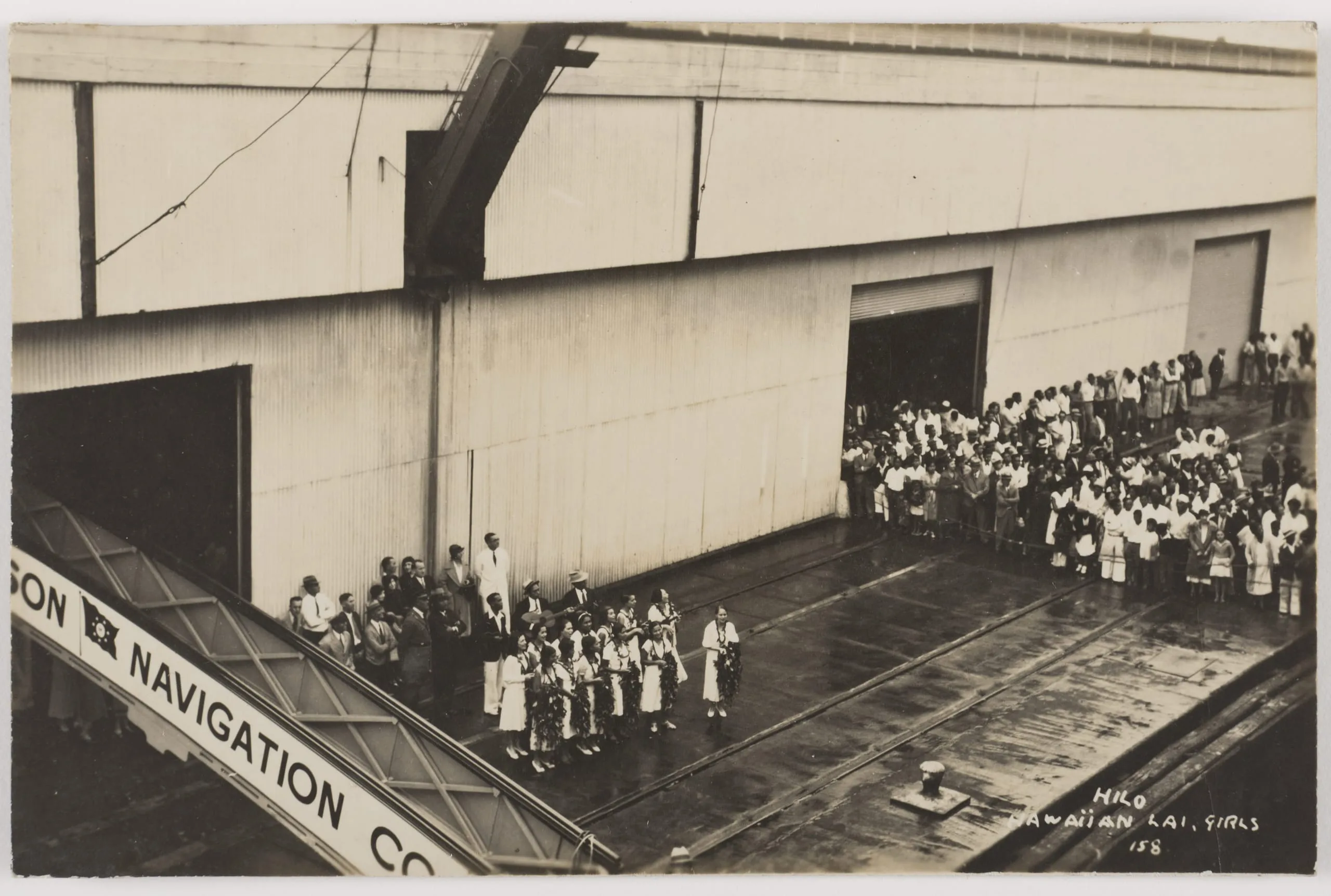 Sepia-toned photograph looking down onto a dock beside a corrugated warehouse, with a large crowd and a group of lei-wearing women near a ship's gangway marked 'Navigation Co.'