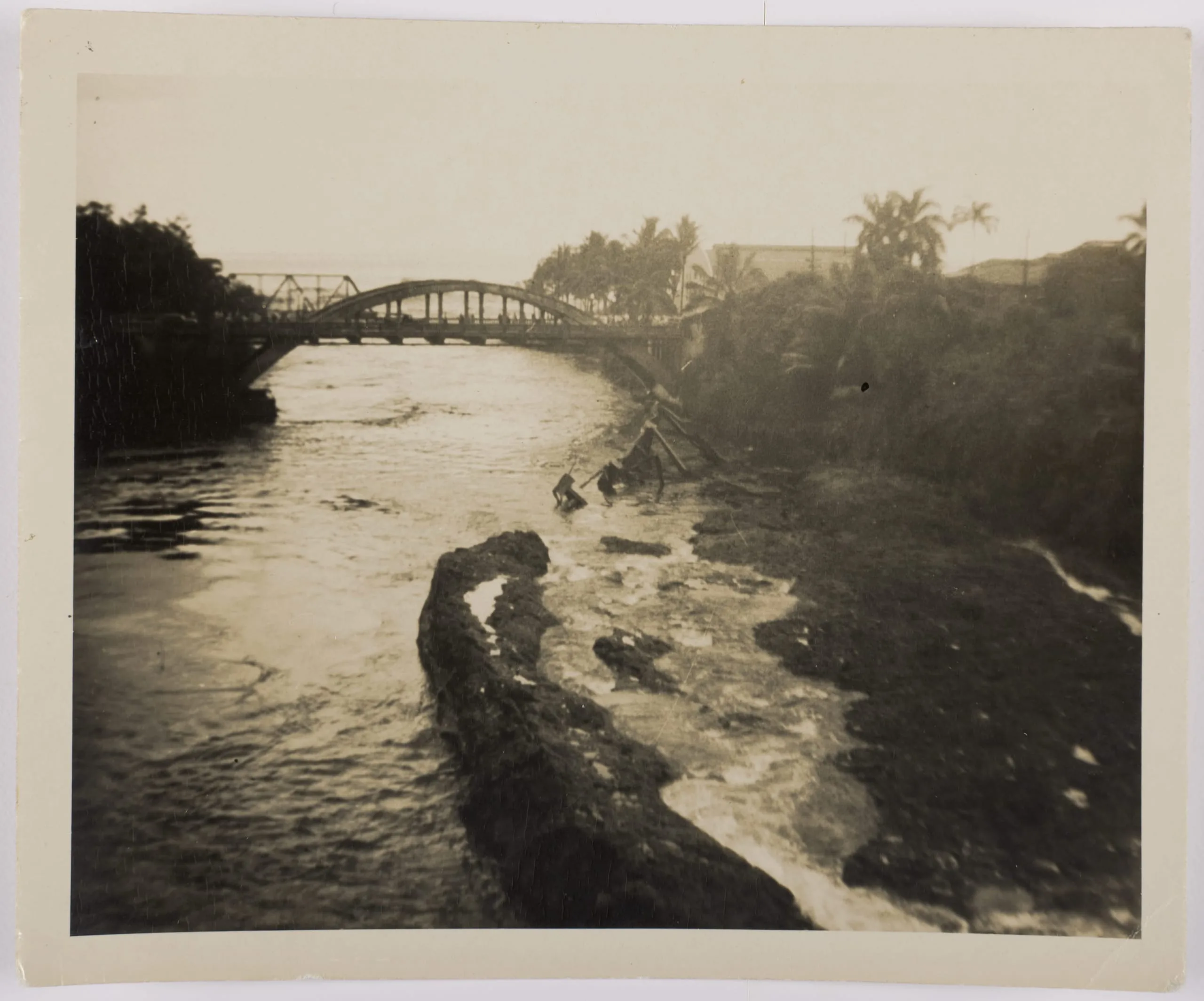 Sepia-toned photograph of a turbulent river with exposed rocks and debris, a collapsed wooden structure to the right, and a low arched bridge in the distance lined with palm trees