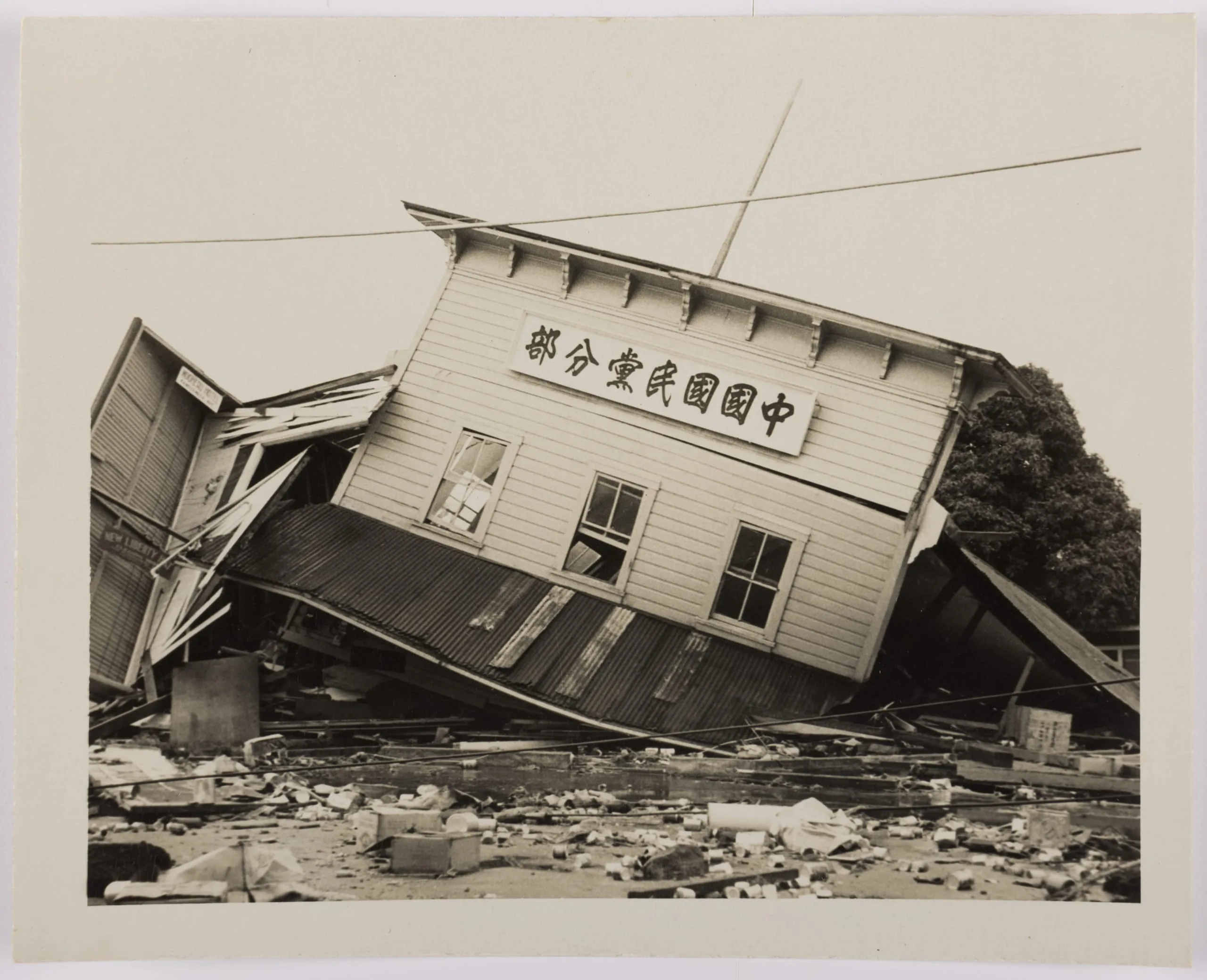 Black and white photograph of a collapsed two-story wooden building tilted sharply to the left, with Chinese characters on a sign across its facade and rubble strewn across the ground
